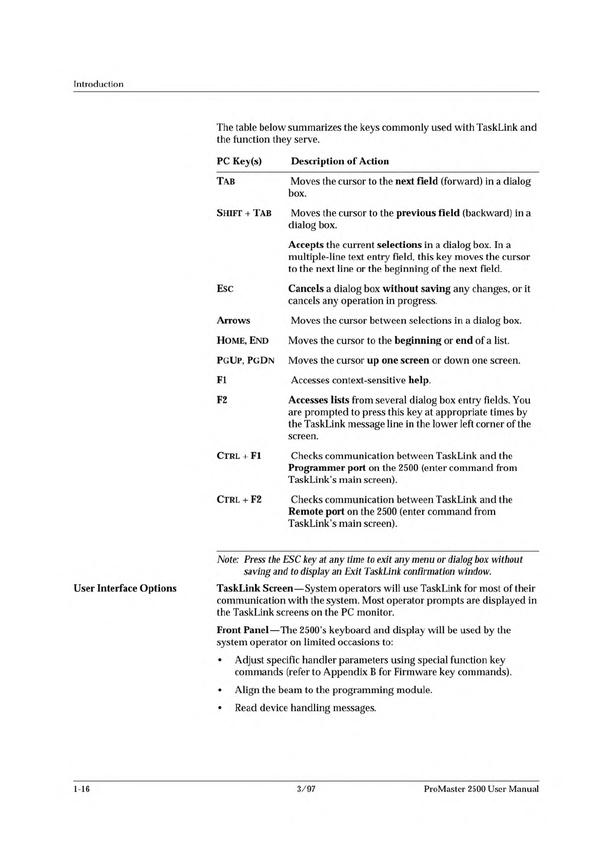 ↵ Introduction The table below summarizes the keys commonly used with TaskLink and the function they serve. PC Key(s) Description of Action Tab Moves the cursor to the next field (forward) in a dialog box. Shift + Tab Mo…