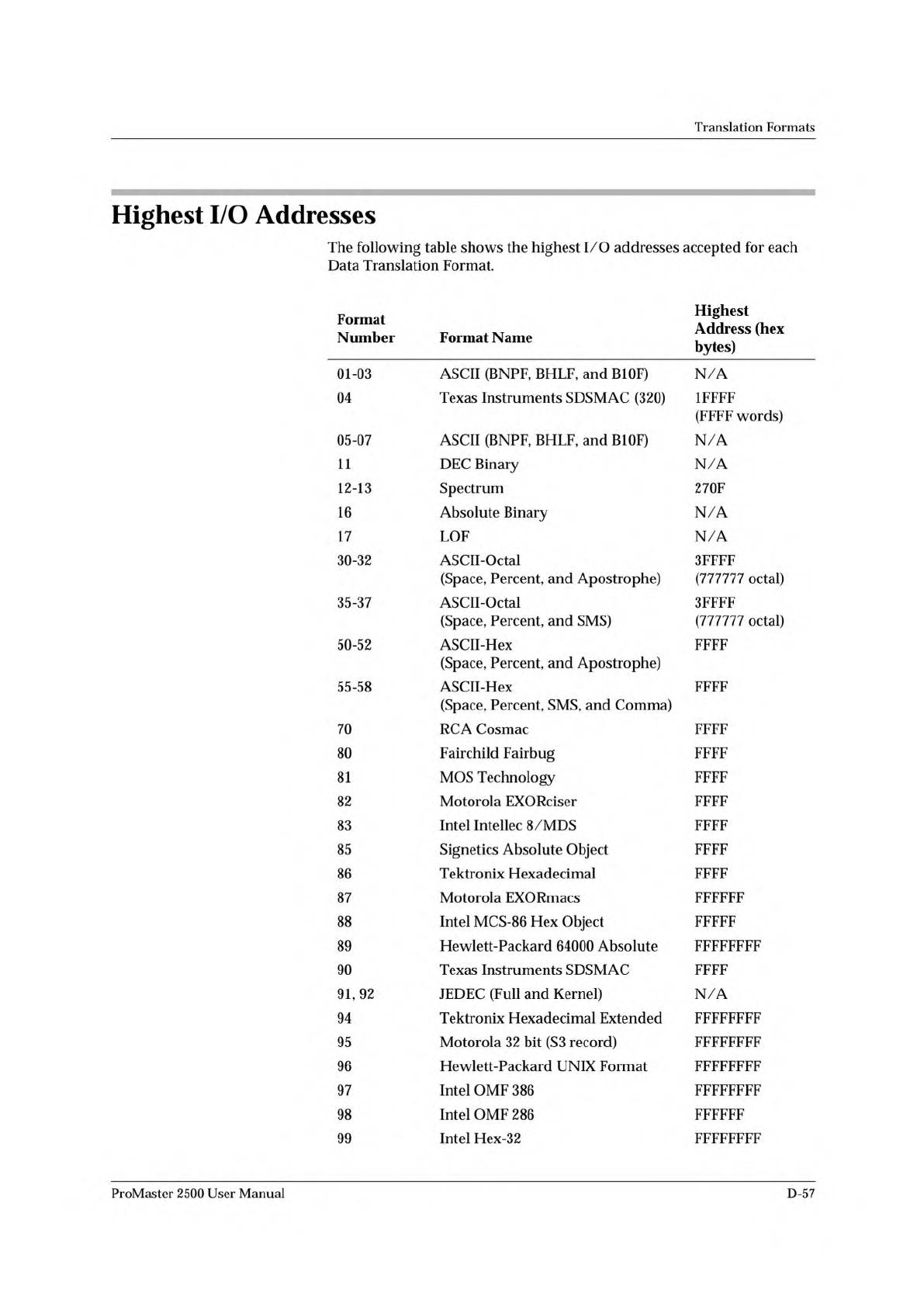 Translation Formats Highest I/O Addresses The following table shows the highest I/O addresses accepted for each Data Translation Format. Format Number Format Name Highest Address (hex bytes) 01-03 ASCII (BNPF, BHLF, and …