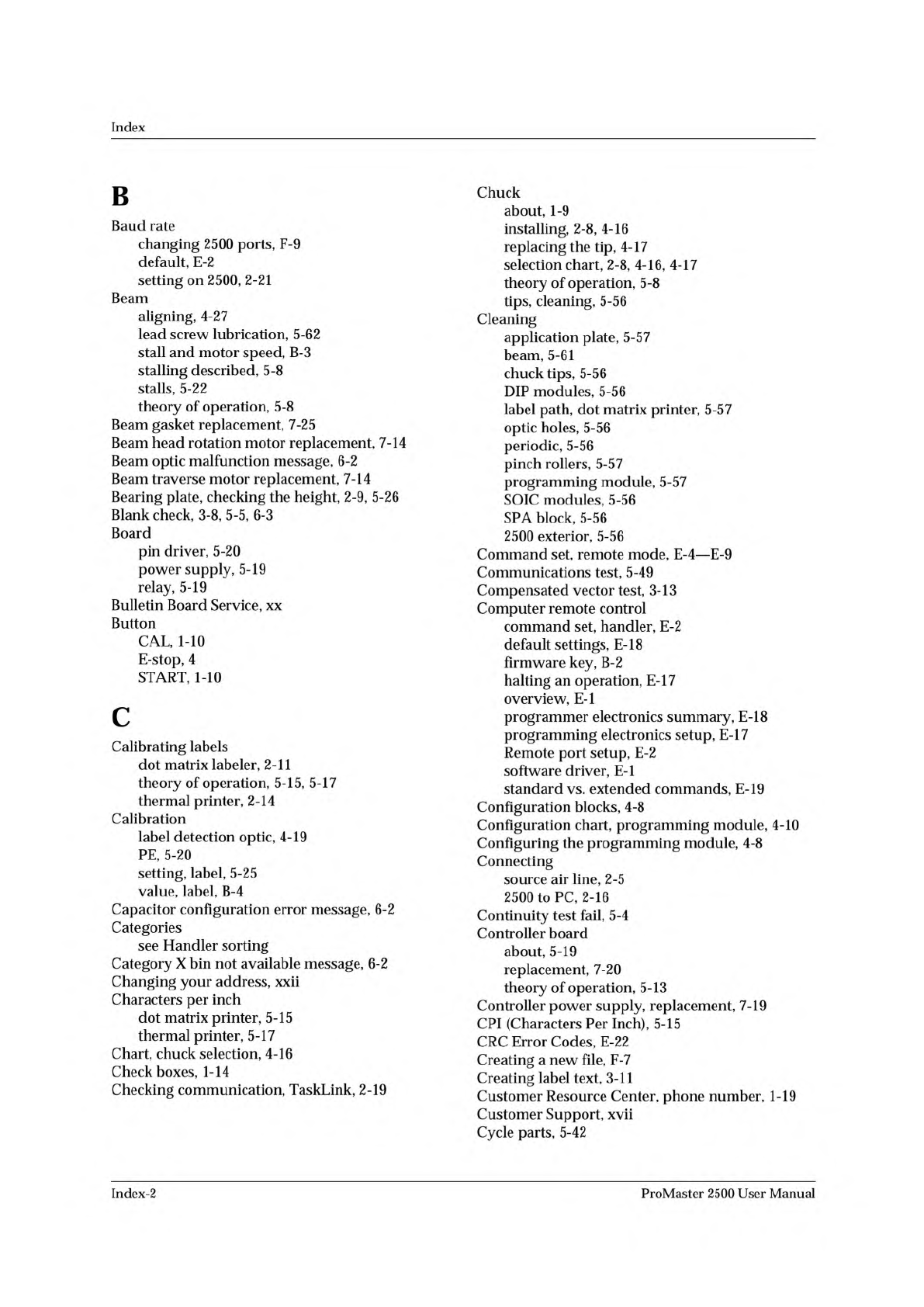 Index D Daily maintenance, 5-56 Downloading data files, 3-17 Dust guard, cleaning, 5-56 Data I/O addresses, xvii — xviii Bulletin Board Service, xx contacting via BBS, xx contacting via phone, xix Data source, 3-7 Data s…
