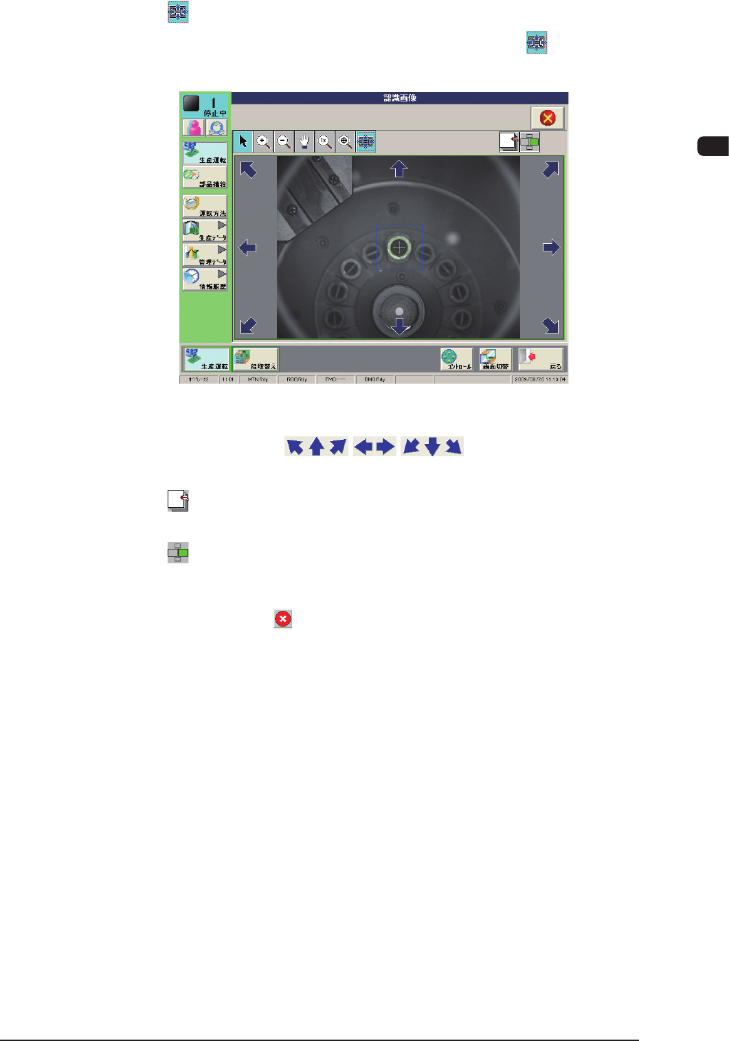 1OM-1609 2-13 2 章 2. 操作画面 1007-003 [ ] ボタン : 画像目合せモード 認識画像をシングル表示したのち、[ ]ボ タンを押すと画像移動ボタンを表示します。 F1B6-3 画像移動ボタン( ボタン) 選択したボタンの矢印が示す方向に画像を移動します。 [ ] ボタン : 切替えボタン 表裏判定、極性判定の画像切替えを行います。 [ ] ボタン : マルチモード表示ボタン …