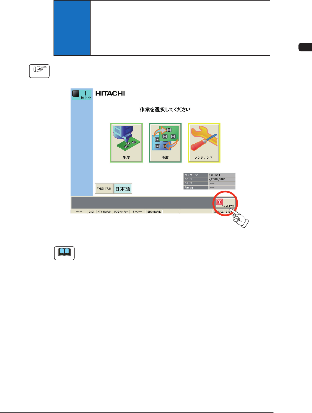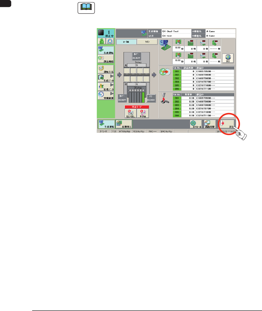 1OM-1609 2-16 2 章 4. 終了 4. 終 了 4.1 ログアウト 操作画面を終了する場合は、共通メニューバーの [ 戻る ] ボタンを押しま す。 操作画面を終了してトップ画面に戻ります。 ノート “パターンプログラム”編集画面など、各種の編集画面が表示されてい るときは、 [ 戻る ] ボタンを押す前に、各編集画面をそれぞれの操作手 順に従って終了させておいてください。 F1B9 1 103-004