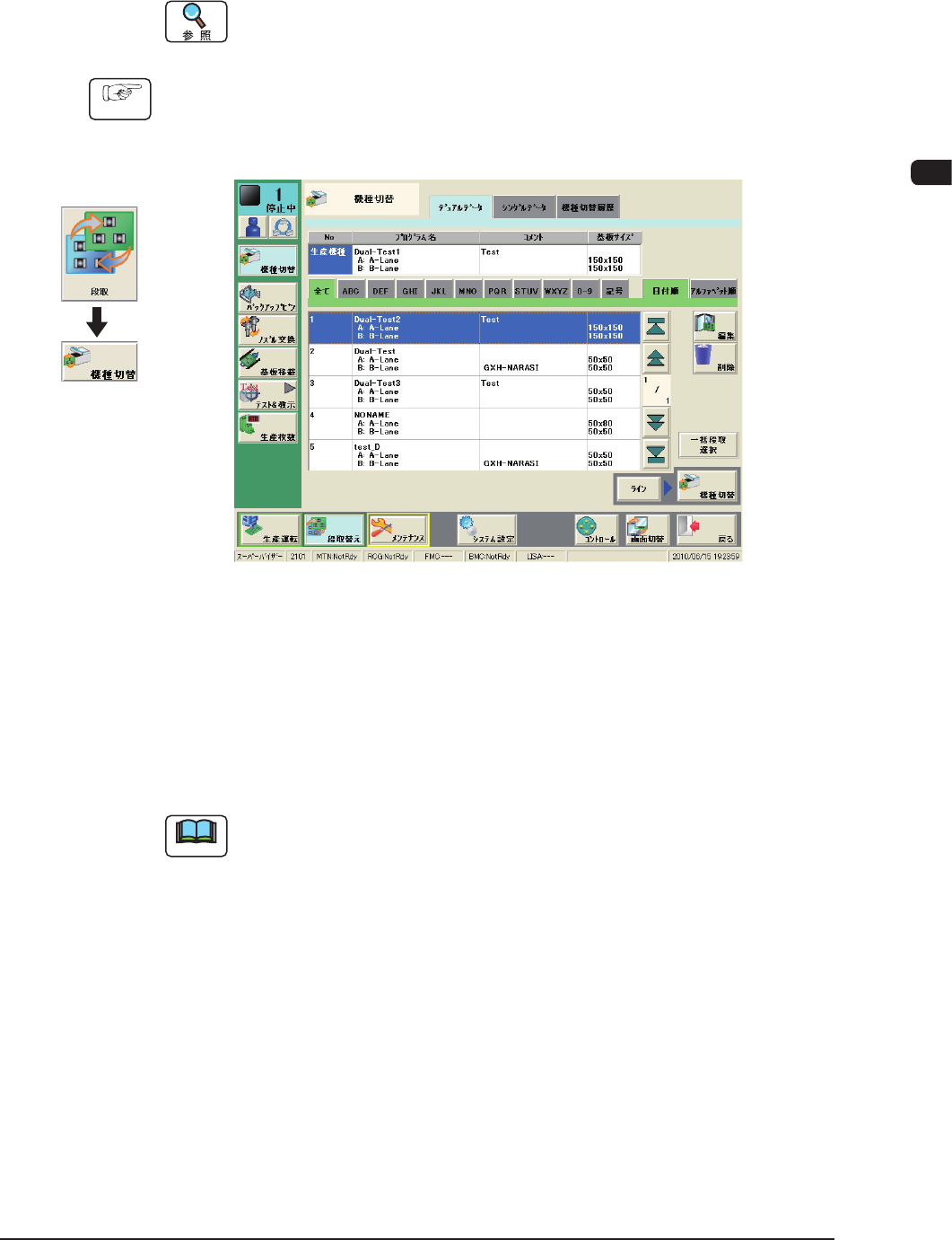 (1)共通メニューバーの[段取替え ]ボタンを押し、“機種切替”画面