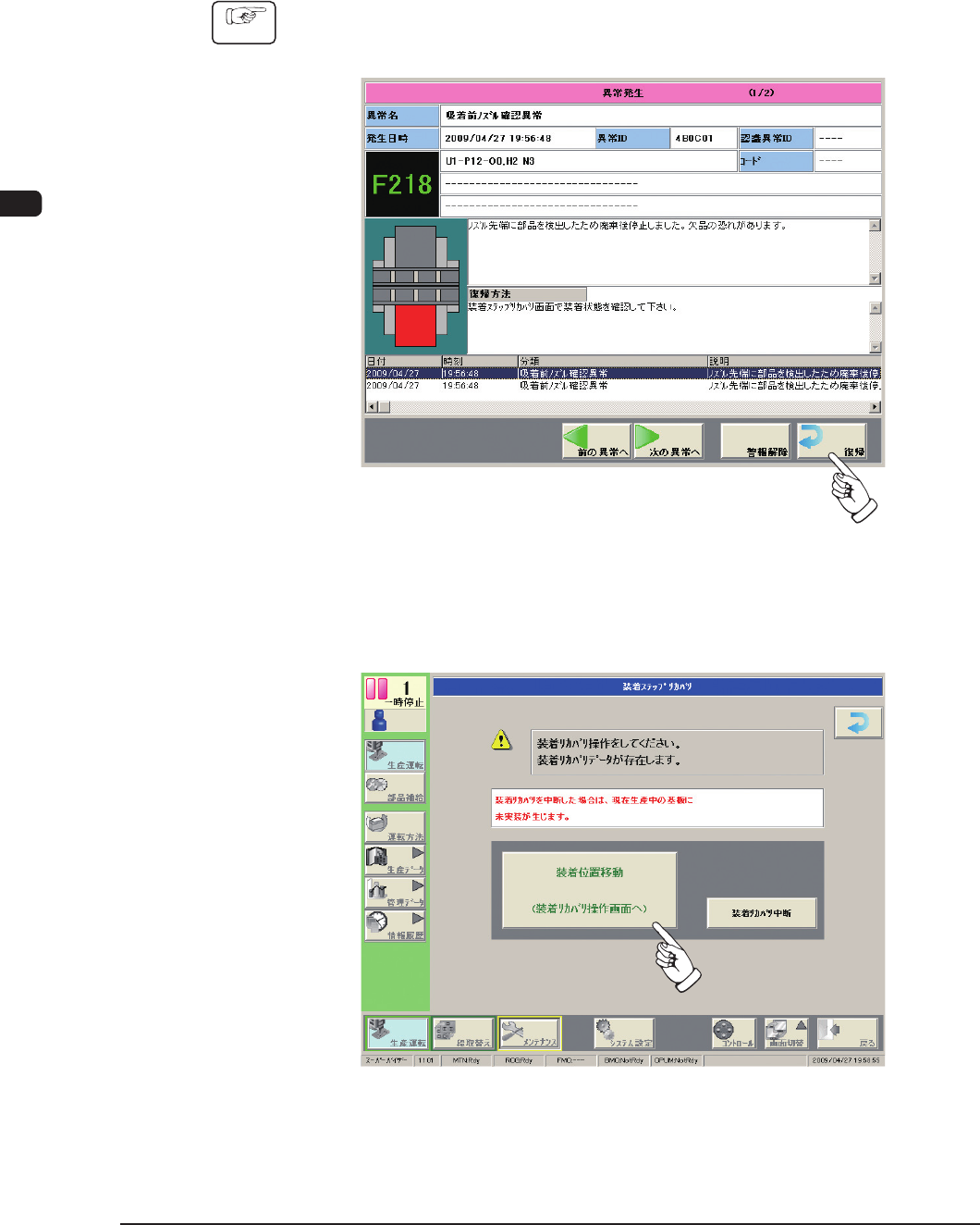 1OM-1609 3-44 3 章 5. 運転の停止、中断と再始動 5.4 装着リカバリでの生産再開 吸着前ノズル確認機能を使用している場合、部品吸着前にノズル先端に異 物や部品が検出されると、 “吸着前ノズル確認異常”画面が表示され、装 着リカバリ操作が可能となります。 手順 (1) [ 復帰 ]ボタンを押す。 (“装着ステップリカバリ”画面が表示されます。) F1C27 (2) [ 装着位置移動 ]ボタンを押す。 …