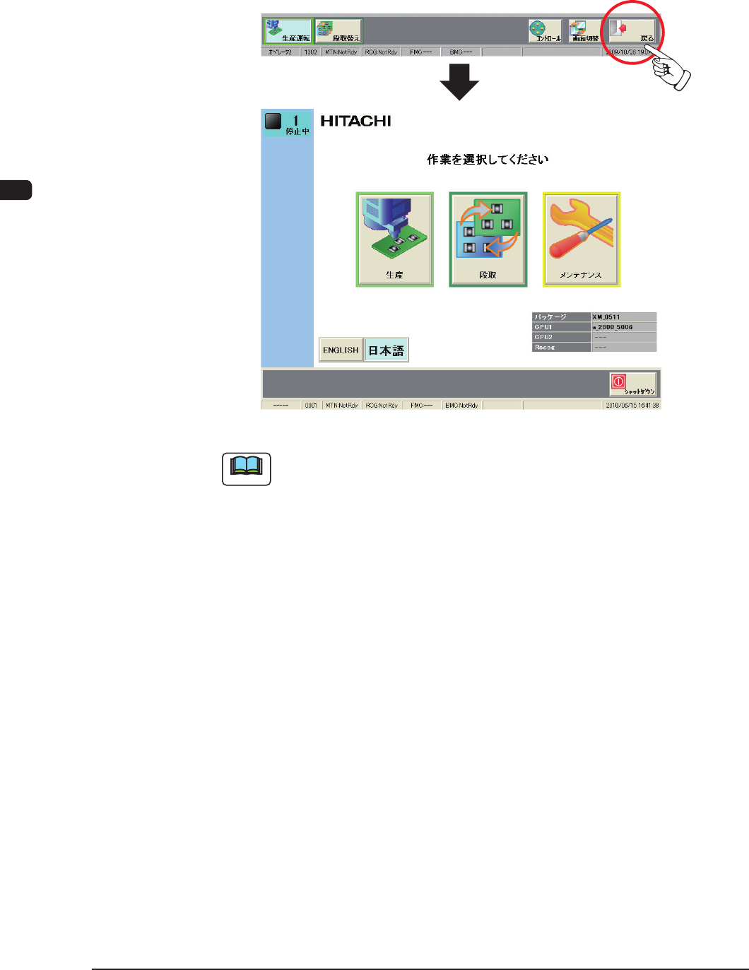 1OM-1609 3-47 3 章 5. 運転の停止、中断と再始動 5.5 生産運転の終了 5.5.1 生産運転の停止 • 基板生産枚数停止機能による生産運転の停止 “基板生産枚数停止”機能を使用している場合は設定された基板数生産 を行うと自動的に装置が停止します。 基板生産枚数停止機能については“2 巻6 章8.生産枚数動”を参照 してください。 • [ 払い出し ] による生産運転の停止 操作画面上部の状態表示部で、[ 払…