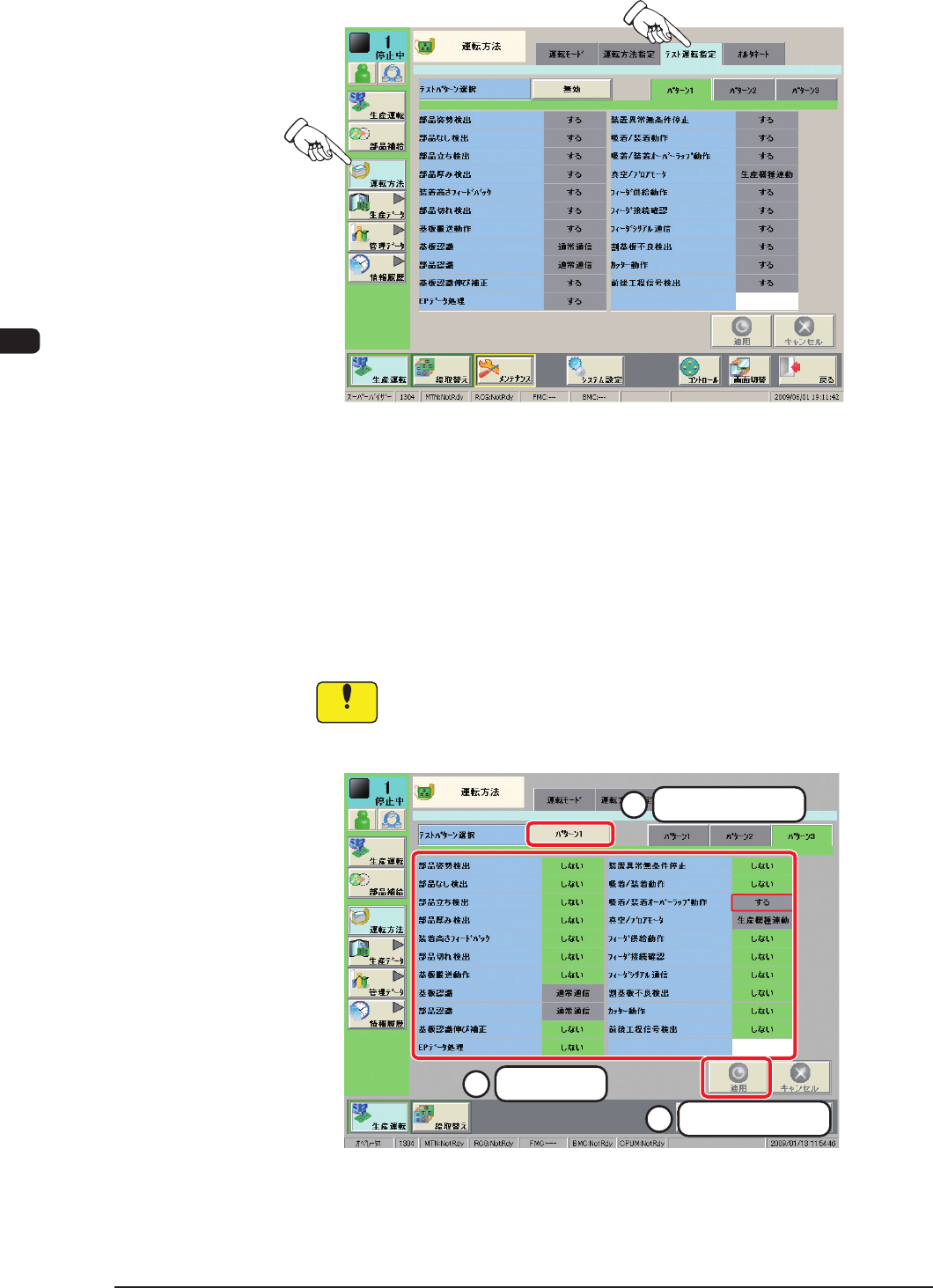 1OM-1609 3-50 3 章 6. 慣らし運転 (2) “運転方法”画面の“テスト運転指定”タブを表示する。 F1C33 (3) 慣らし運転用のテスト運転パターンボタン( 例えば、 [ パターン 3] ボタン )を押す。 (4) 慣らし運転のテスト運転方法を選択し、 [ 適用 ]ボタンを押す。 ( 指定したテストパターンが慣らし運転用に設定されます。) 推奨する選択 :すべて“緑色”にしてください。 注 …