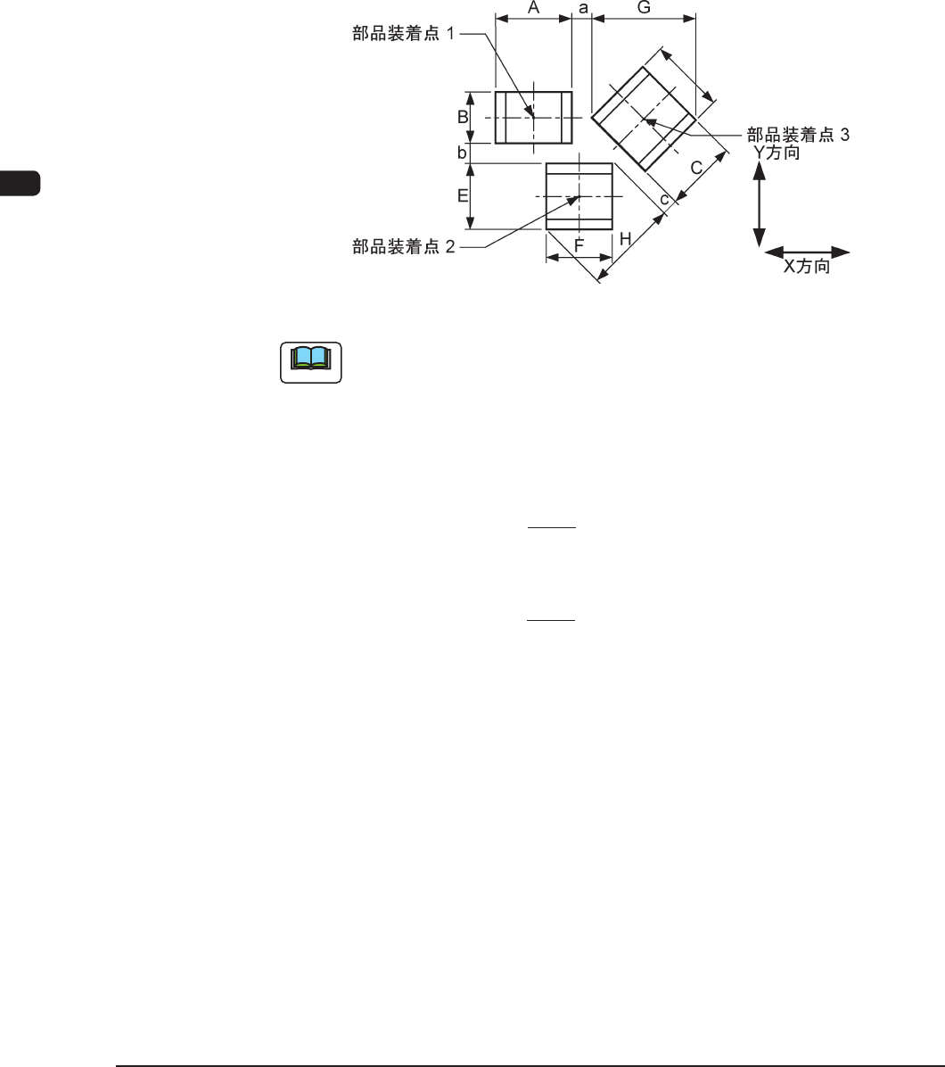 1OM-1609 4-16 4 章 3. 部品装着条件 3. 部品装着条件 (1) 吸着ノズル形状 先付け部品または障害物等に接近して部品を装着する場合、吸着ノ ズルの形状が制約条件の一つとなります。吸着ノズルの形状につい ては、 “吸着ノズルタイプ一覧表” を参照してください。 (2) 部品装着位置を考慮した場合の部品隣接間隔 F1E1 ノート (a) F1E1 は、 吸着ノズルが部品の外形から出ないときの状態を示します。 …