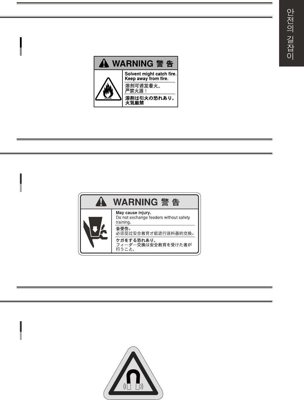 xiv 3 .2 주 의 표 시 3.2. 1 인체에의 영 향 ■ 주 의내 용 c 주의 커버 내의전 원 부를만 지면 ,감전 될위험 이있 으므로주의 하 여주십시 오 . ■ 대상 장 비 모든 장 비 고압주의 만지면 감전 위험 있음 9110 1- L C - 0 0 ■ 주 의내 용 c 주의 가동 부의모터 는고 온상 태이 므로만 지지말아주십시 오 . ■ 대상 장 비 모든 …