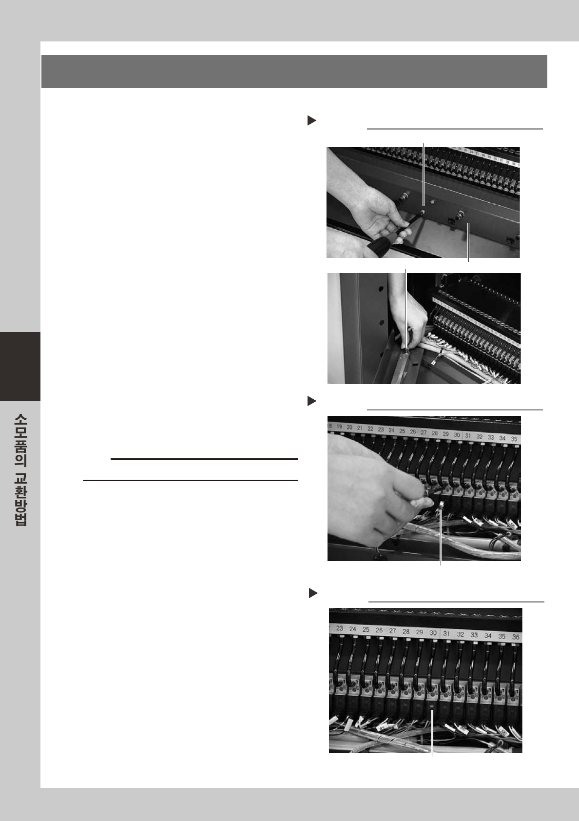 4-7 4 5 . 기 판반 송 부 의 청소 와 벨 트 교 환 e 1 비상 정지 버튼 을 누 릅니다 . 작 업 을안전하 게하기위 해 ,반드시장비 를비상 정 지상 태로해주십 시오 . 2 벨 트를 풉니 다 . 육각 렌 치 (4 ) 로텐셔 너볼 트를풀 고 , 긴구멍끝 까 지 ( 푸는방향 )텐셔 너를이 동시 켜주십시 오 . 57 414 - L 5 - 0 0 3 벨 트를…