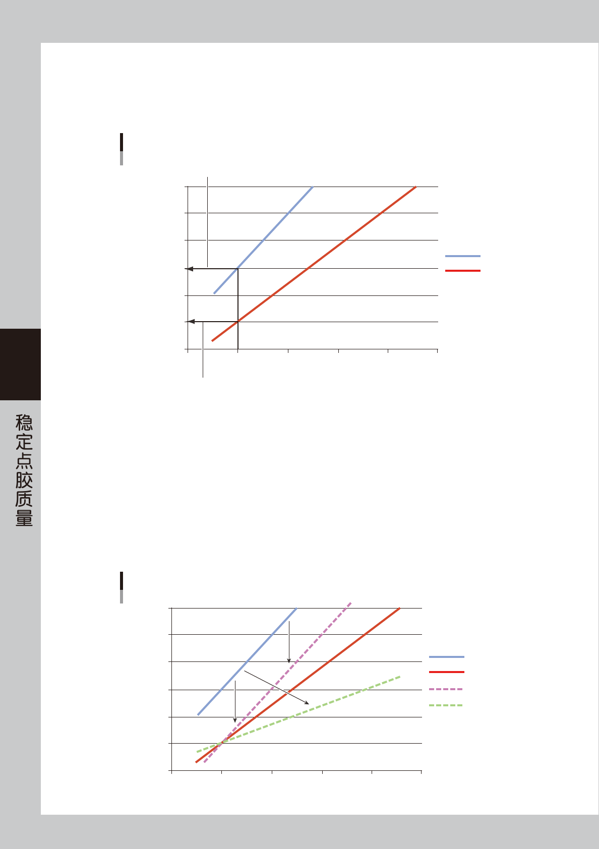 4-30 4 6 根据测量结果绘制曲线图。 1. 根据创建点胶校正表时 ( 余胶 100% 的胶筒 ) 测量的各定时时间的胶点面积与在 Step5 中记录的余胶为 10 〜 50% 的胶筒测得的各定时时间的胶点面积,用 Excel 工作表绘制曲线图。 下面,以余胶为 100% 与 10% 的胶筒测得的胶点面积为例绘制曲线图。 0 0.1 0.2 0.3 0.4 0.5 0.6 0 20 40 60 80 100 曲线图1 例 胶量[ms…