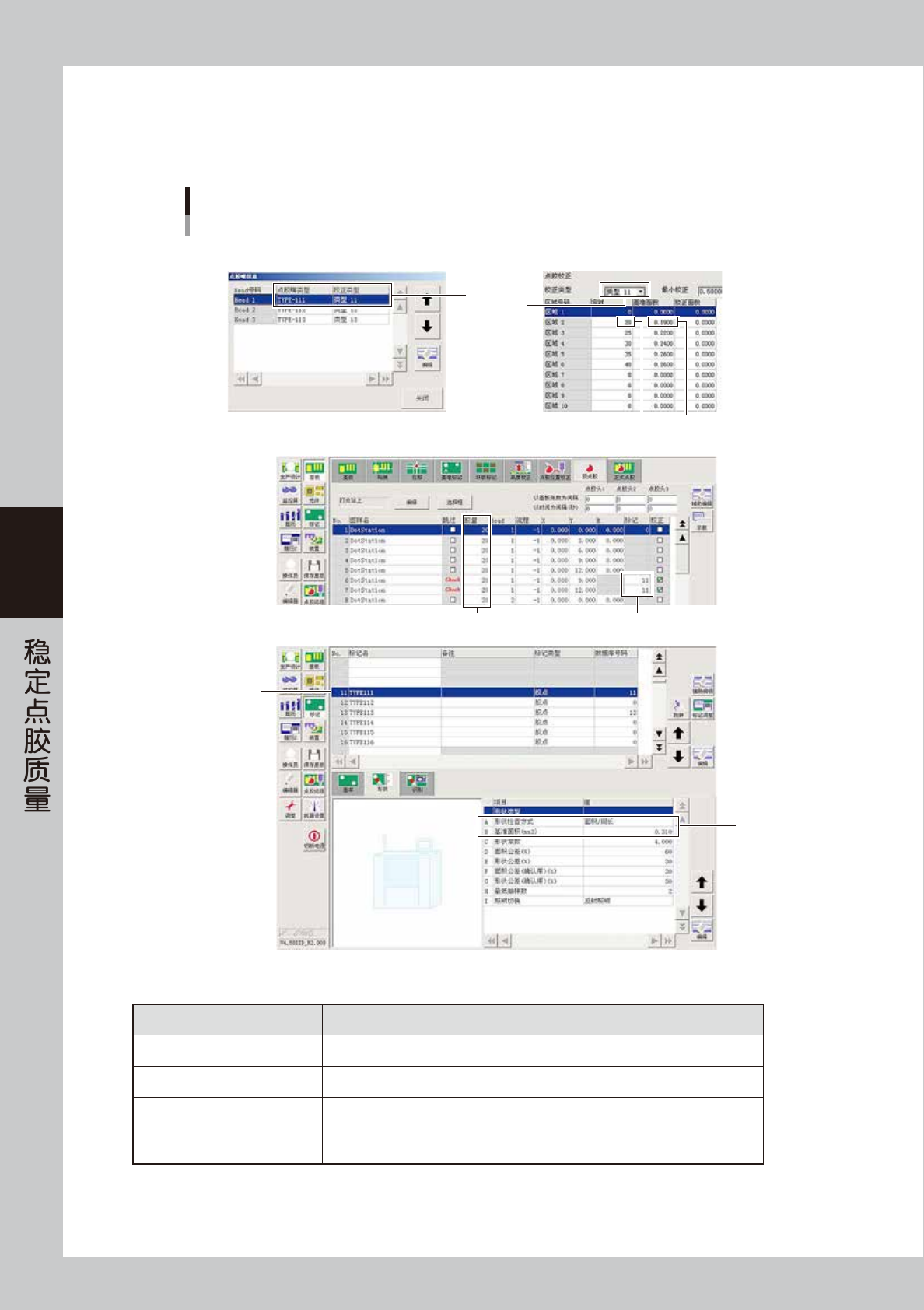 4-34 4 3.2.8 确认各项设置是否一致 为确保校正能正常进行,需确认下图所示画面中各项设置是否一致。 下面,以 TYPE-111 点胶嘴的设置为例介绍。请根据下述要领进行确认。 各项设置的确认 以TYPE-111点胶嘴的设置为例 ■ [生产设计] - [点胶嘴]画面 ■ [机器设置] -“点胶校正”画面 ■ [基板] -“预点胶”画面 ■ [标记]画面 1 1 4 4 3 3 2 2 66431-7-00 ■ TYPE-111 …