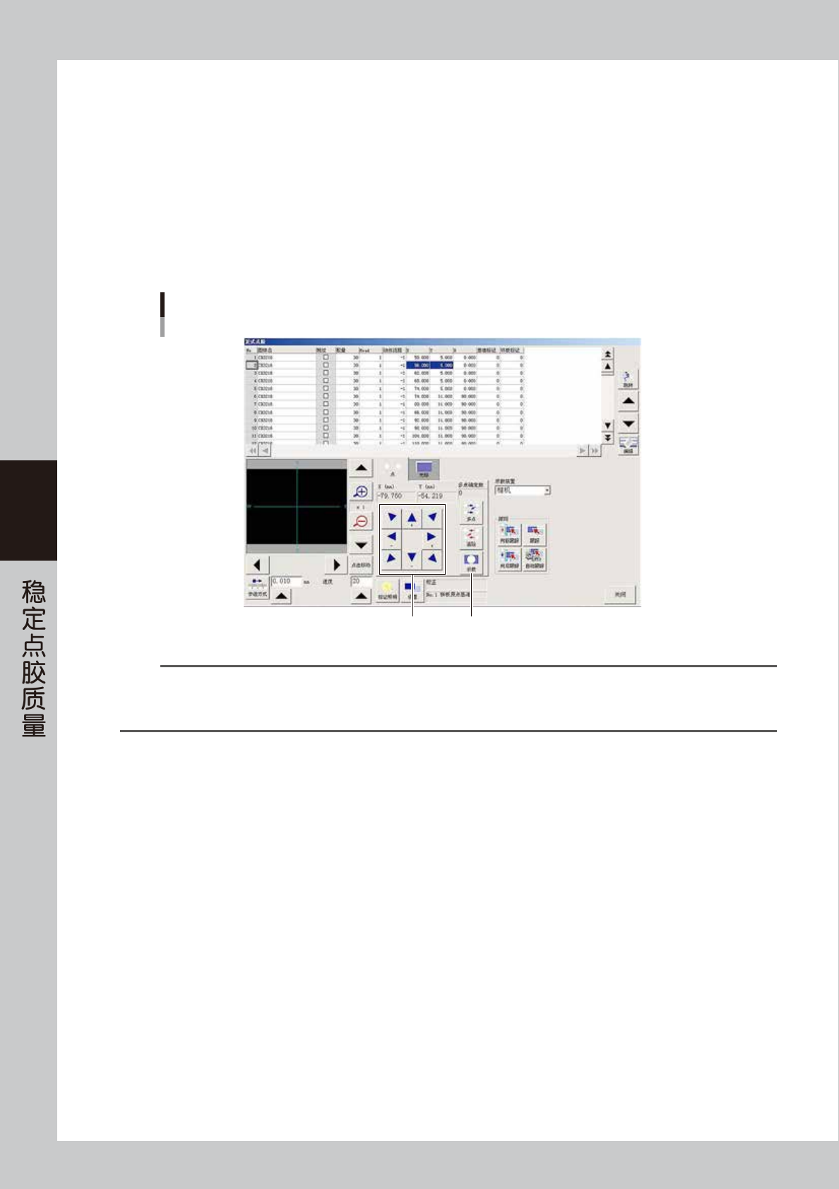4-58 4 5 修正 X、Y 数据。 如果视窗中的十字光标偏离了点胶位置的中心,必须修正 X、Y 的数据。 修正方法,有直接输入数值的方法与通过示教输入的方法 2 种。 · 直接输入数值 读取视窗上 X、Y 方向需要修正的量之后,直接输入在 X、Y 单元格中。 · 通过示教输入 输入步骤 : 1. 按箭头按钮移动相机,使视窗中的十字光标移到点胶位置的中心。 2. 按 [ 示教 ] 按钮,坐标数据自动更新为当前相机的位置。 示教操作 箭…