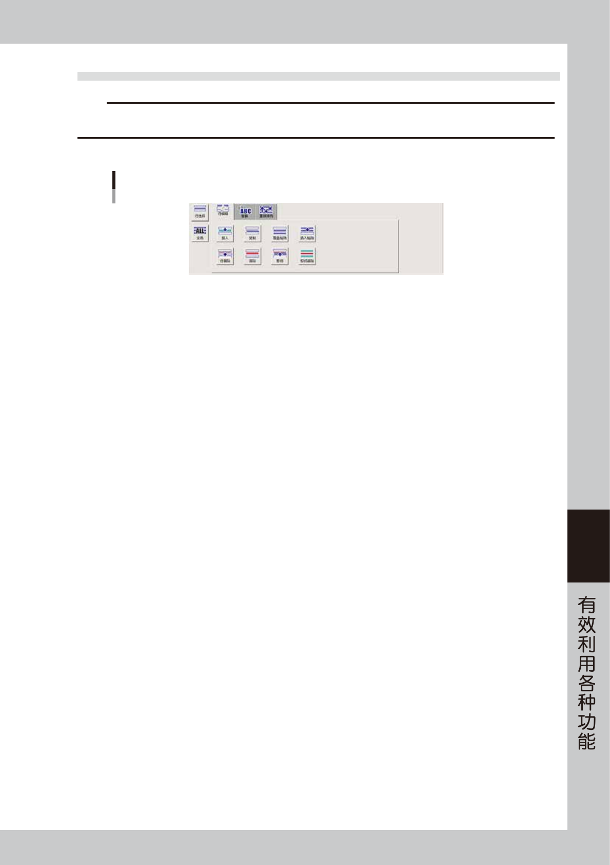 6-17 6 3.3 行编辑 c 注意 在“No.”列以外被排序的状态下,无法使用行编辑。进行行编辑时,必须在“No.”列中排列为升序。如果没有指定选择范围,则 当前所在行 ( 光标所在位置 ) 为选择范围。 “行编辑”选项卡中,设置有各种按钮,用于以行为单位编辑表格选择范围内的数据。 “行编辑”选项卡 66617-N7-00 ■ 插入 在选择范围的首行上面,插入选择行数的空白行。 ■ 复制 将所选范围的行复制到剪贴板。 ■ 覆盖粘贴 …