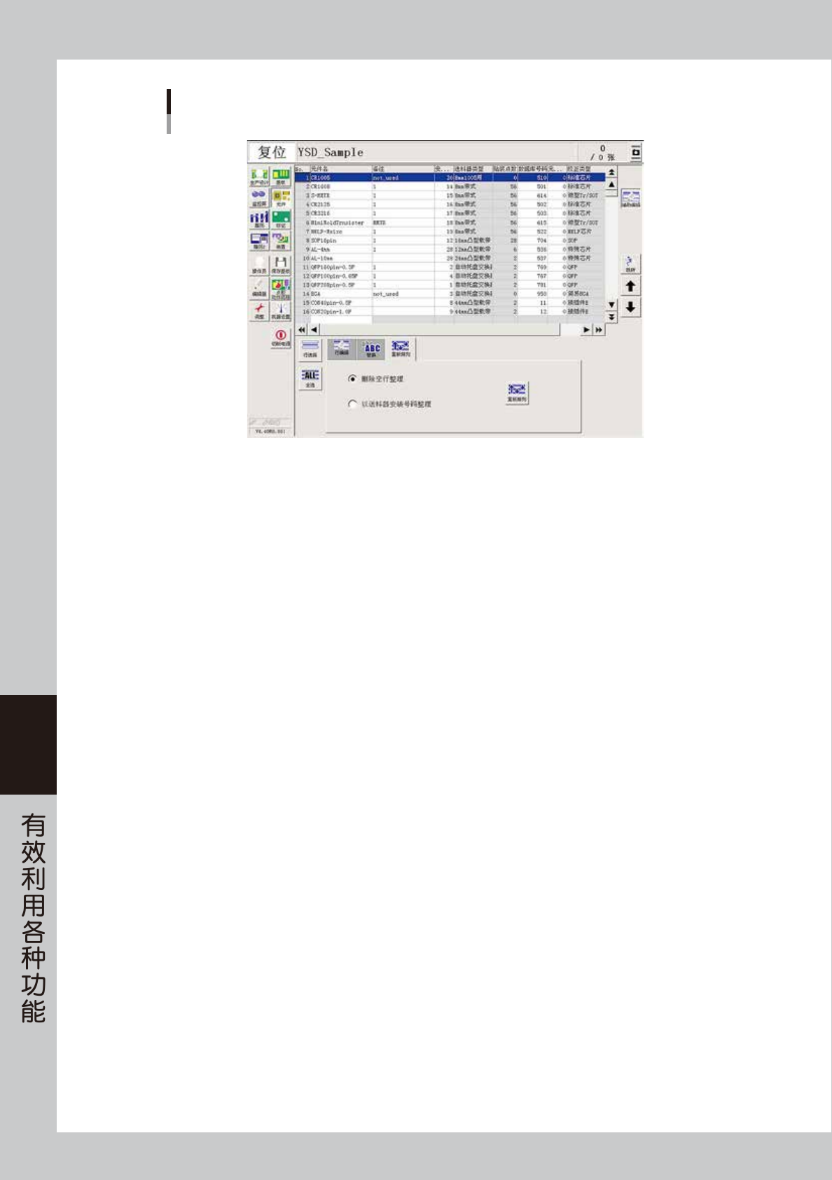 6-19 6 3.5 重新排列 “重新排列”选项卡画面的显示内容,根据所选按钮不同有下列两种显示。 · [ 基板 ] 按钮画面内的重新排列对象为 : 贴装、位移、基准标记、坏板标记、预点胶、正式点胶。 · [ 元件 ] 按钮画面内的项目为 : “删除空行整理”和“以送料器安装号码整理” 。 [重新排列]按钮 基板 66620-N7-00 ■ 优先级 此号码决定重新排列的优先级。最多可以设置 10 级。 ■ 项目 选择进行重新排列…
