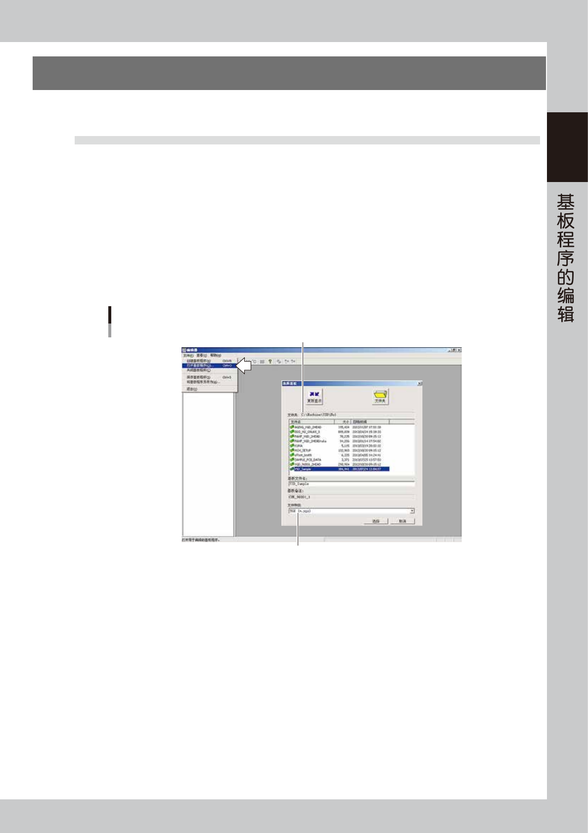 7-1 7 1. 利用编辑器编辑 使用编辑器可以编辑基板程序。 1.1 编辑器的启动 1 启动编辑器。 按 [ 编辑器 ] 按钮,启动编辑器。 2 选择需要编辑的基板。 1. 选择“文件 (F)”菜单中的“打开基板程序 (O)”命令或点击工具栏中的 [ 打开基板程序 ] 按钮, 打开“选择基板”画面。 2. 选择文件的种类。 3. 选择基板,点击 [ 选择 ] 按钮。 基板程序被读入之后,显示编辑器画面。 选择基板 确认路径 选择…
