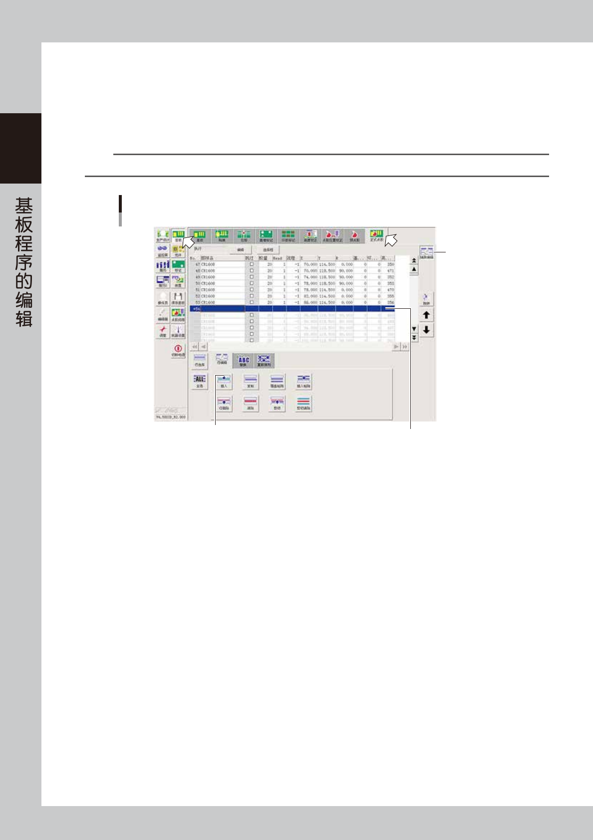 7-27 7 4.2 删除点胶数据 下面,介绍在正式点胶数据中删除点胶数据的方法。 ■ 使用点胶扩展时 1 删除贴装数据。 1. 按 [ 基板 ] 按钮,打开“贴装”画面。 2. 按 [ 辅助编辑 ] 按钮,启动辅助编辑。 3. 按“元件号码”栏,使贴装数据按元件号码的顺序排列。 4. 选择需要删除的元件行,按 [ 行删除 ] 按钮,删除该元件的贴装数据。 删除多行数据时,按 [ 行选择 ] 按钮选定范围之后,按 [ 行删除按钮 ]。 …