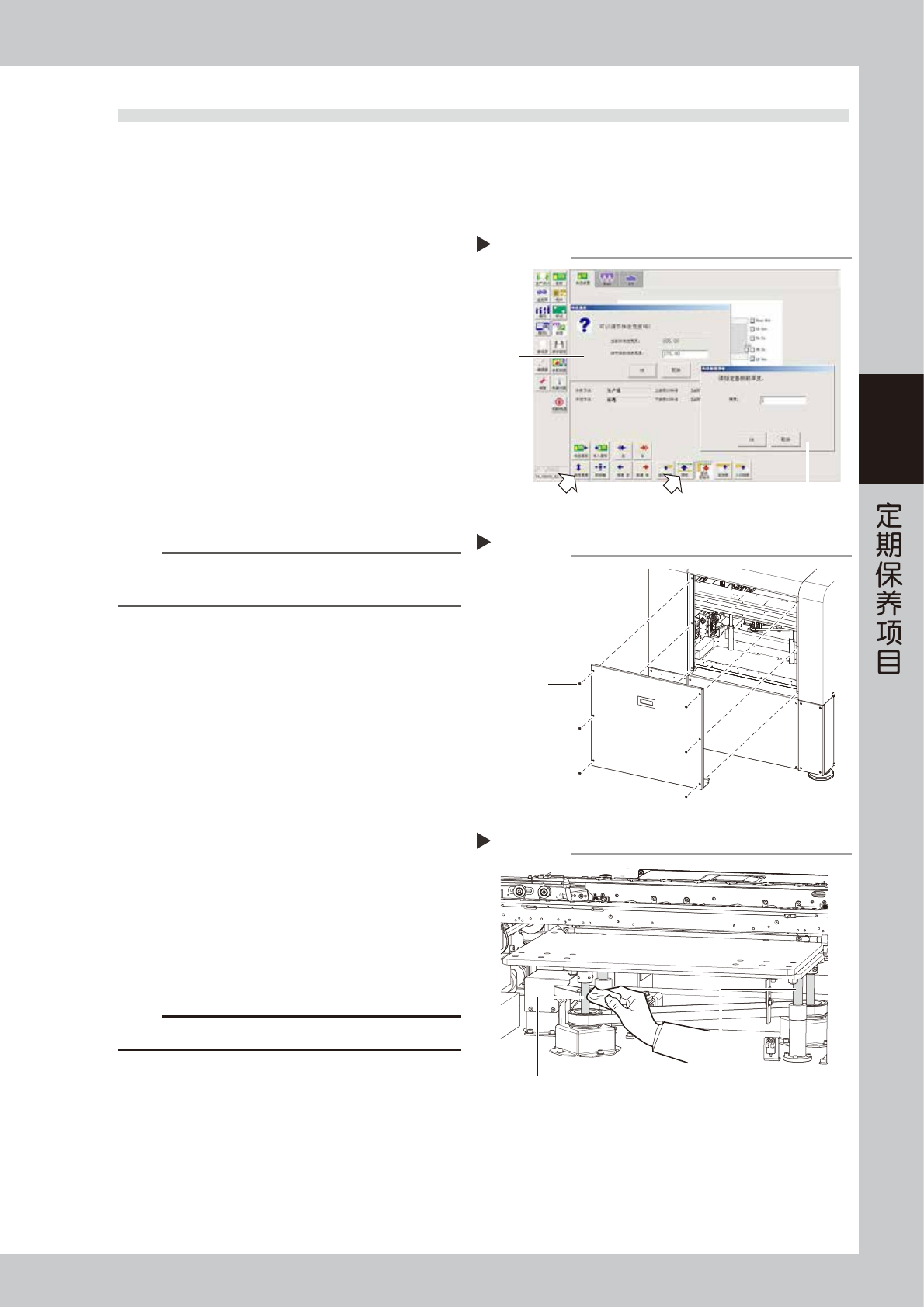 3-1 1 3 4.3 顶板 (PU) 轴的清洁与加油 顶板轴,是在夹固基板时防止基板挠曲,点胶时防止基板下沉的非常重要的轴。为保证顶板轴的功能正常,必须 定期进行清洁与加油。 4.3.1 PU 轴滚珠丝杆、滚珠导杆的清洁与加油 1 将传送宽度调至最小。 1. 取出顶板上的顶针。 2. 按 [ 装置 ] 按钮,选择“传送装置”选项卡。 3. 按 [ 传送宽度 ] 按钮,输入传送宽度规格的下 限宽度后,按 [OK] 按钮。 2 使顶板…