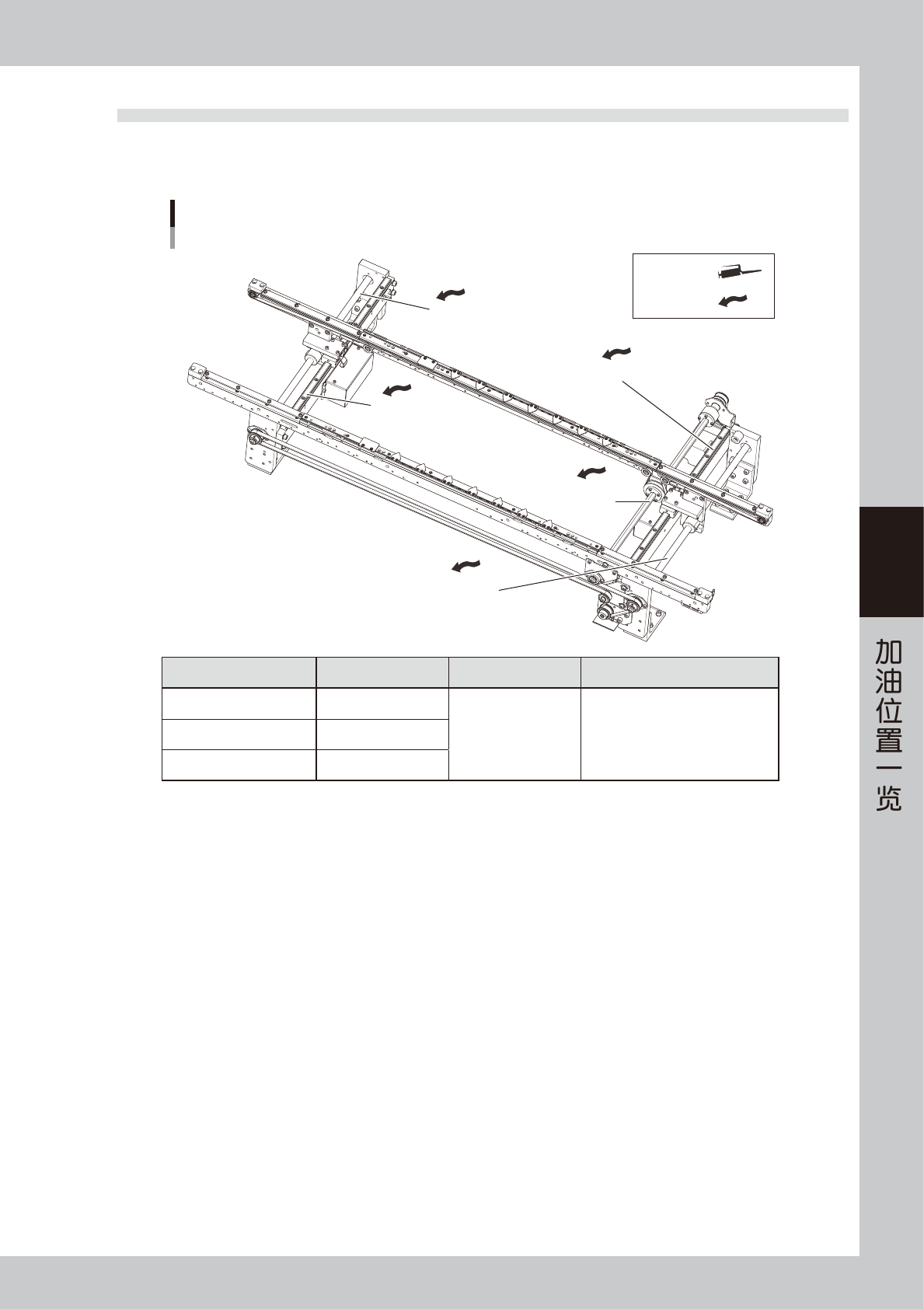 4-5 4 2.4 基板传送部 2.4.1 W 轴导轨、滚珠丝杆与六角轴 W轴的加油位置 导轨、滚珠丝杆与六角轴 W轴导轨 W轴导轨 W轴 滚珠丝杆 W轴 六角轴 润滑油枪 : 用手涂抹 : W轴 滚珠丝杆 加油部位 加油位置 频率 加油方法 导轨 2 1 次 / 月 用手涂抹 滚珠丝杆 2 六角轴 1 55504-N7-00