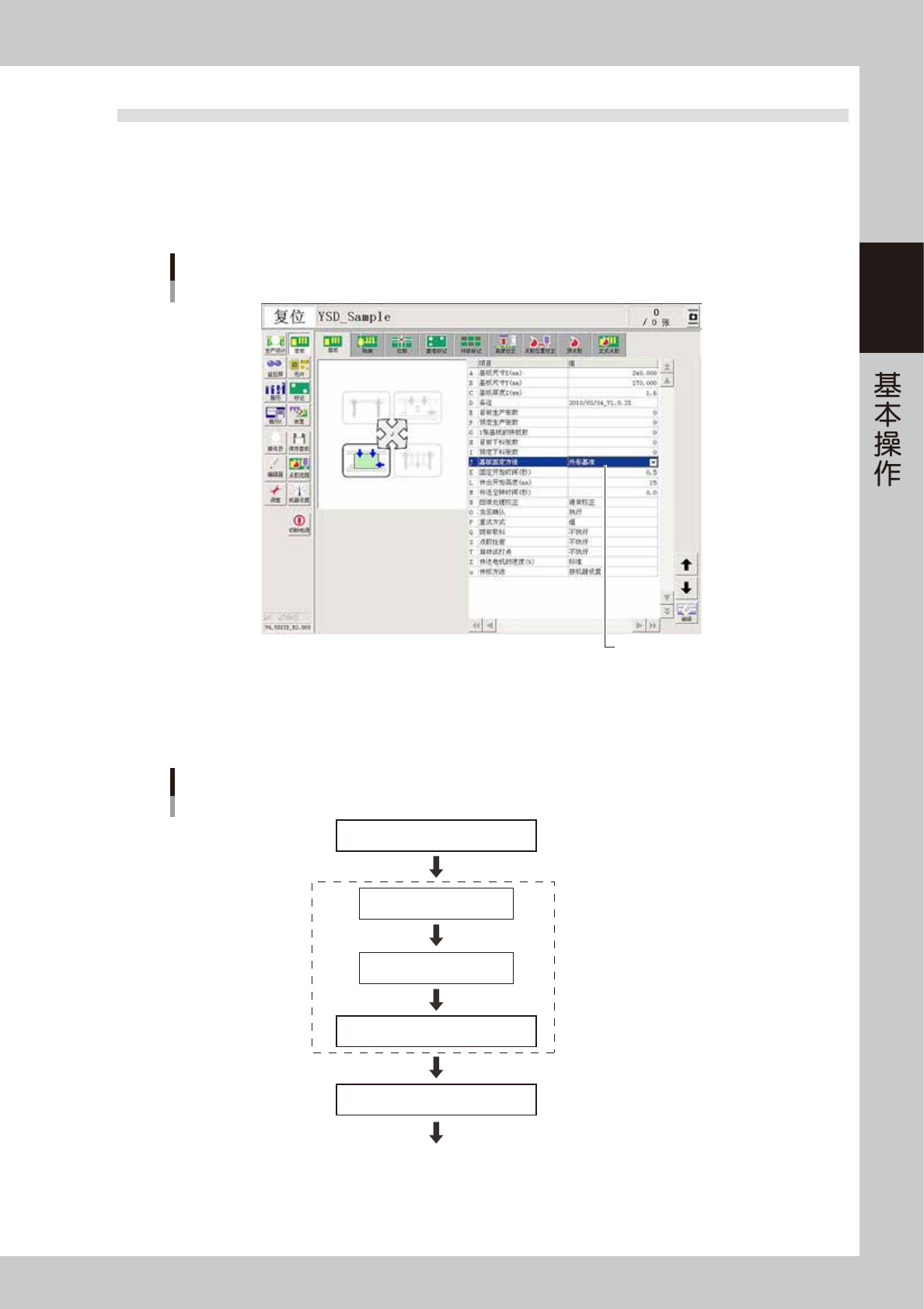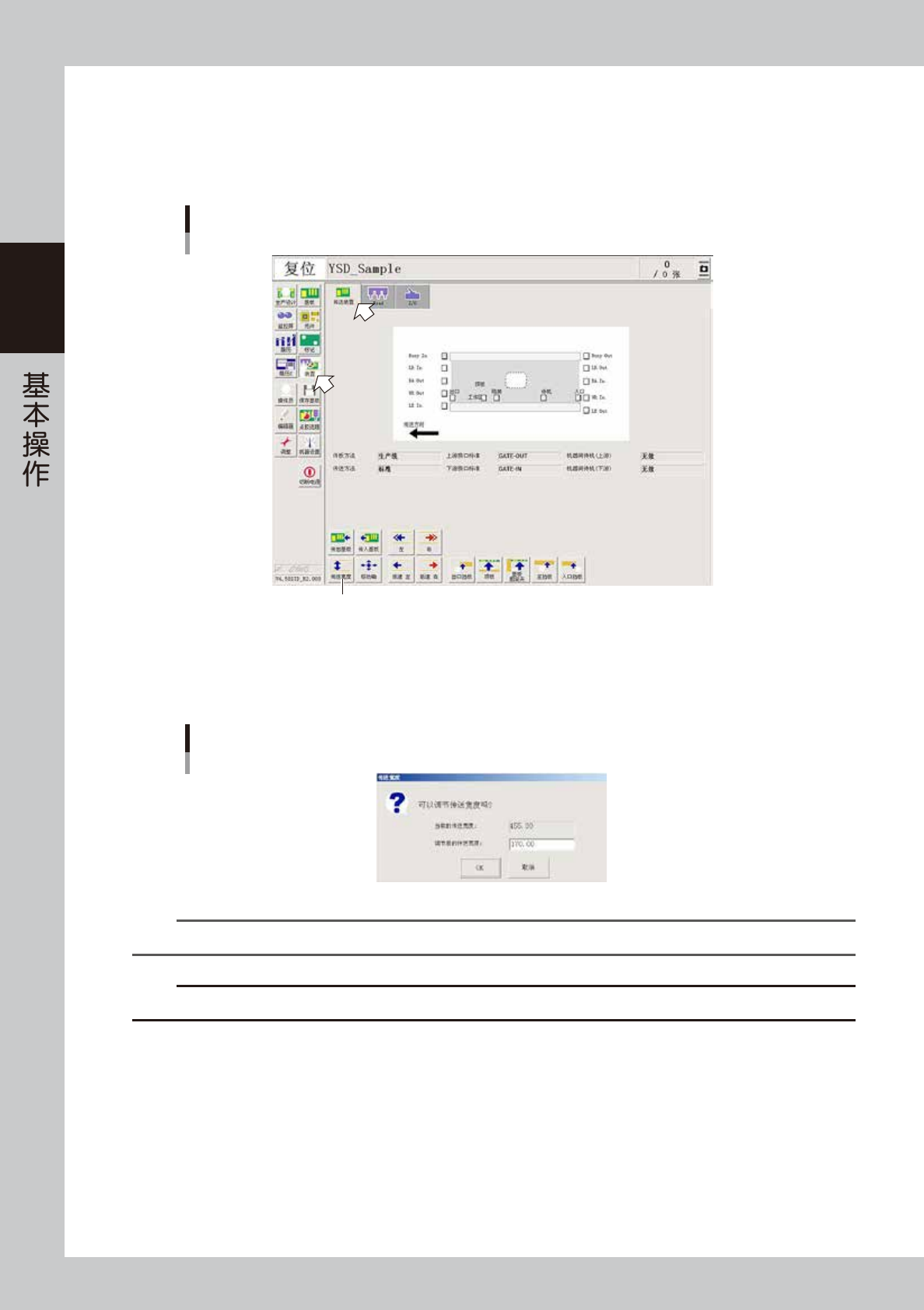 2-18 2 3.4.2 调节传送宽度 按准备生产的基板宽度调节传送宽度。 1 打开 [ 装置 ]-“传送装置”画面。 [装置] -“传送装置”画面 [传送宽度]按钮 66211-N7-00 2 按 [ 传送宽度 ] 按钮。 显示调节传送宽度的对话框。确认显示的传送宽度之后,按 [OK] 按钮。传送宽度变为指定的宽度。 “传送宽度”对话框 66212-N7-00 参考 读入了基板程序时, “调节后的传送宽度”中会显示基板程序中设置的基…