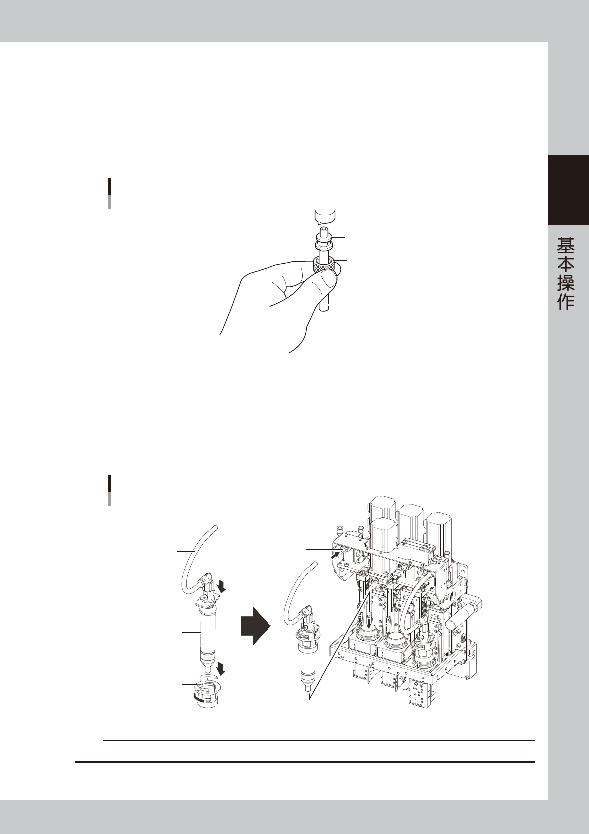 2-22 2 3.5 安装点胶嘴与胶筒 下面,介绍在点胶头部安装点胶嘴与胶筒的方法。 1 打开“更换胶筒”画面。 按“生产设计”画面的 [ 更换胶筒 ] 按钮,打开“更换胶筒”画面。 2 使点胶头移到更换胶筒的位置。 按 [ 移至更换位置 ] 按钮,使点胶头移到更换胶筒的位置。 参考 也可以按下紧急停机按钮之后,用手移动点胶头。 移动点胶头 以3头型(选配)机型画面为例 66205-N7-00 3 确认点胶嘴的类型。 确认准备安装的点胶…