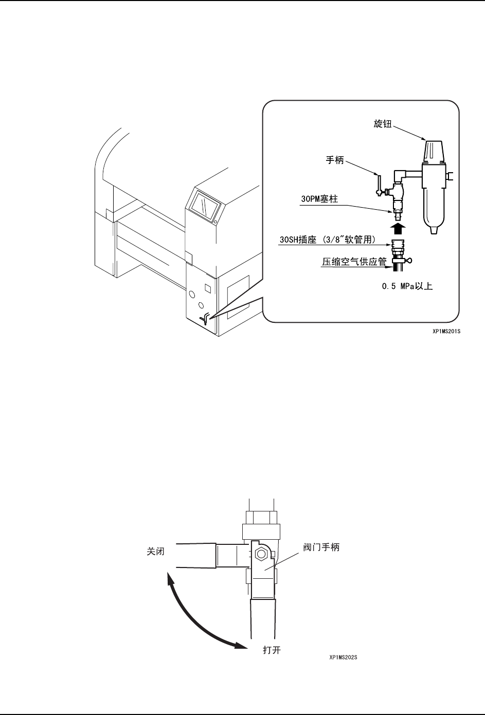 把外部压缩空气供应管接到主机上,并用调节器调整到规定的空气压力 (0.5 M Pa)。