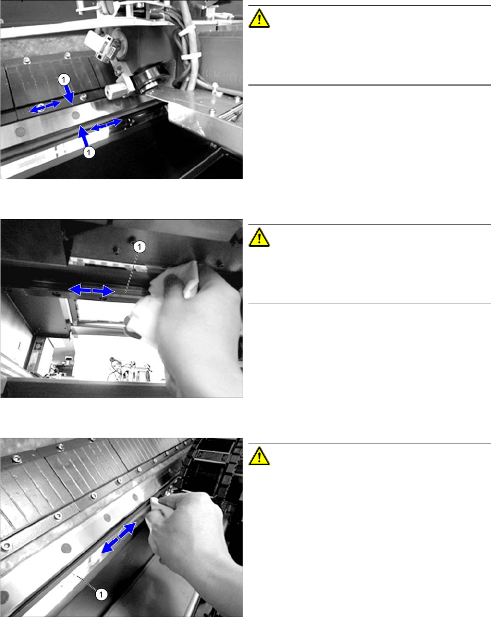 ► Clean the incremental scales (1) of the X axes with a