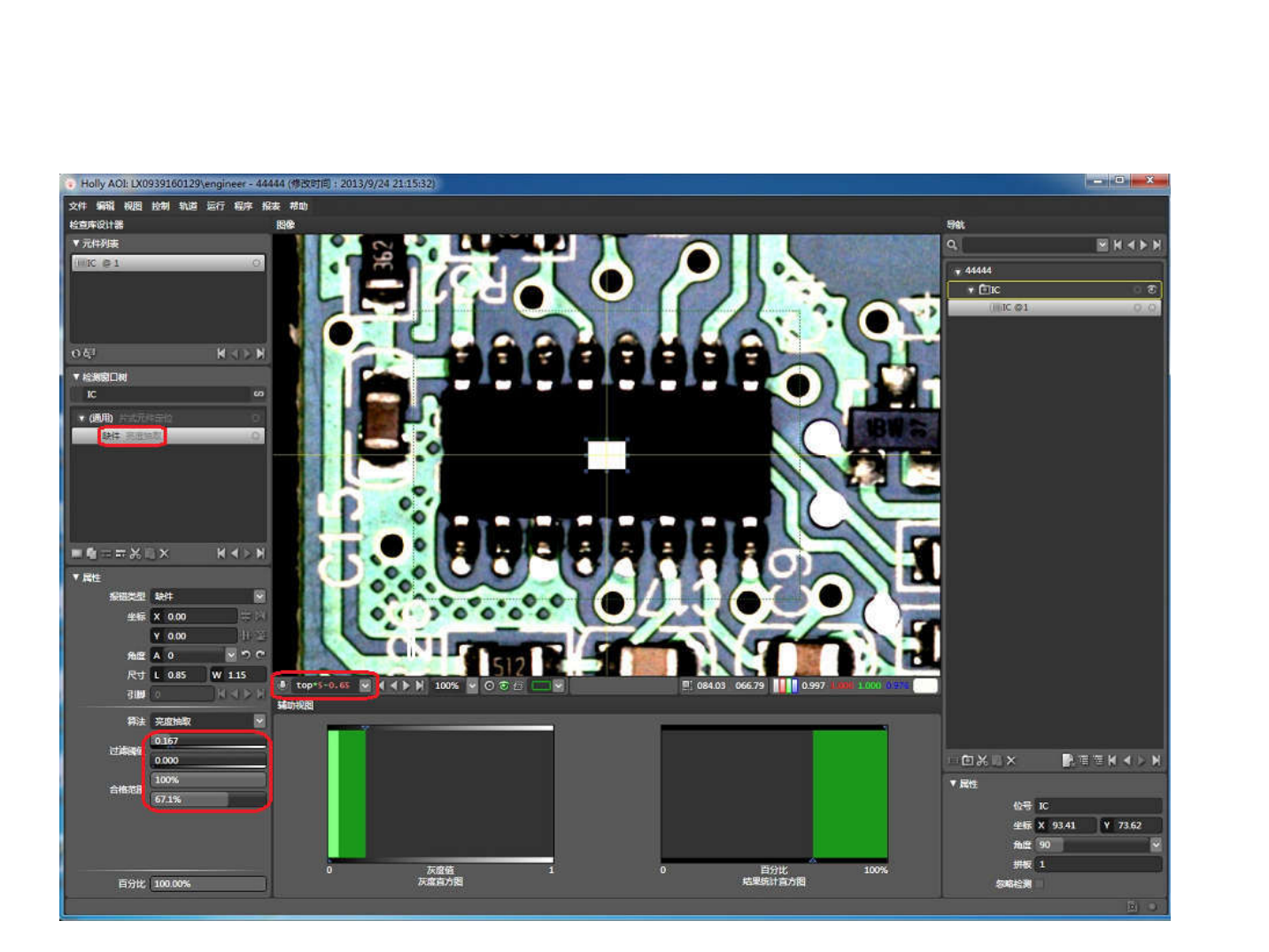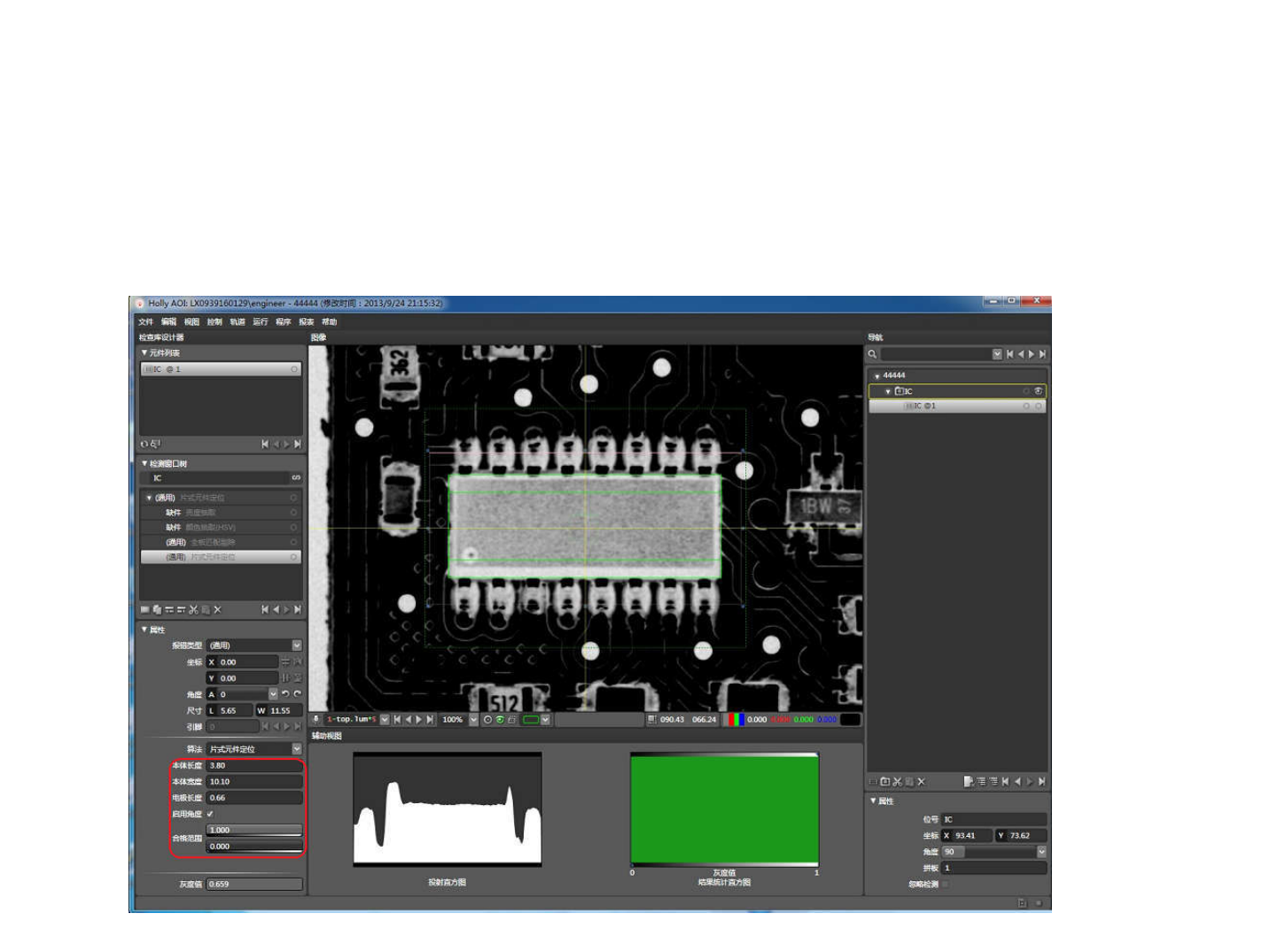 • 1.2. 通用 : • 算法 : 全板匹配剔除 • 光源 : 无 • 参数设定 : 无 • 1.3. 本体定位 • 算法 : 片式元件定位 模板匹配 (RGB) • 光源 : 元件本体较亮 • 参数设定 : 通过设定本体长 , 宽以及电极长度进行定位