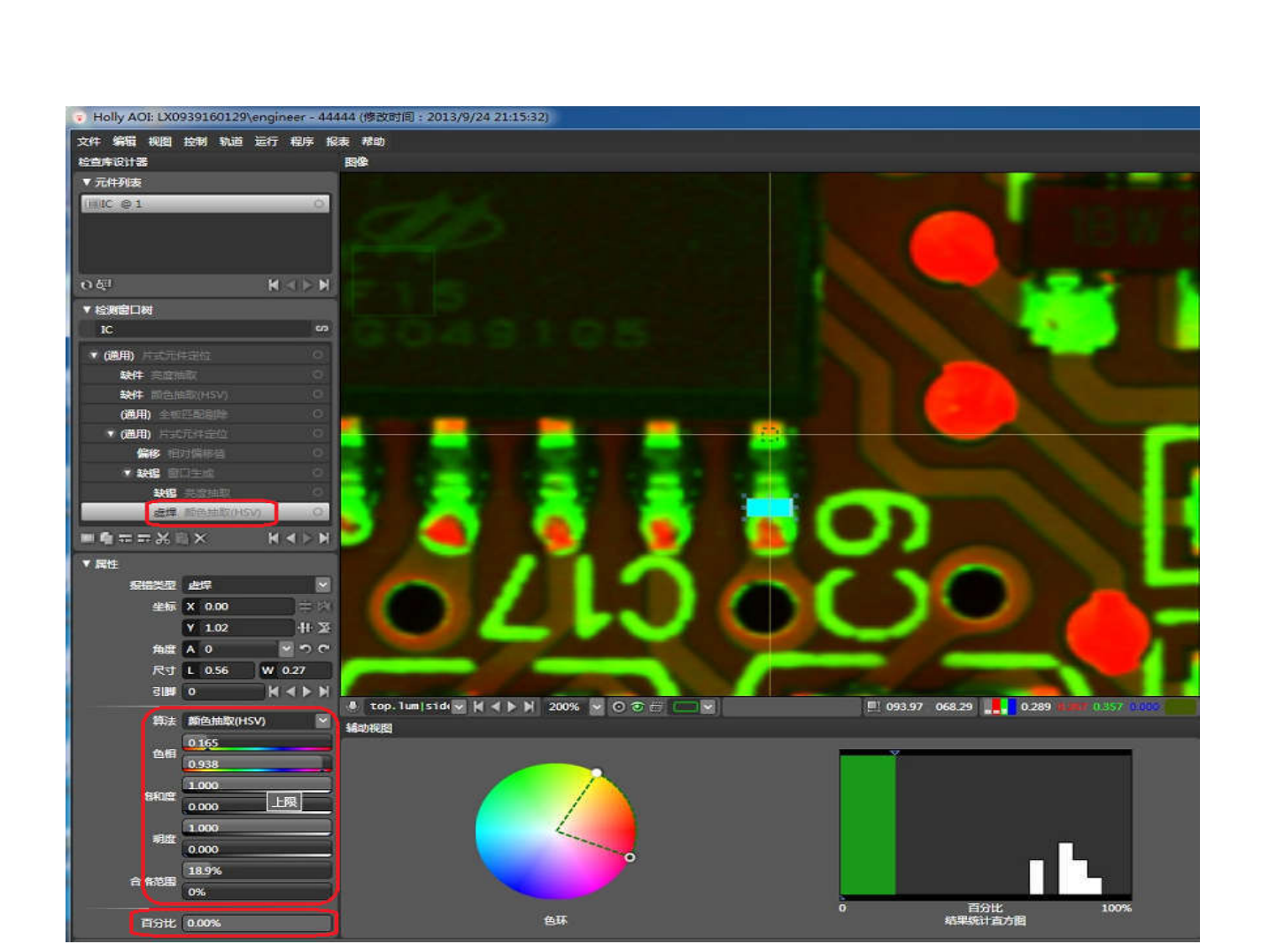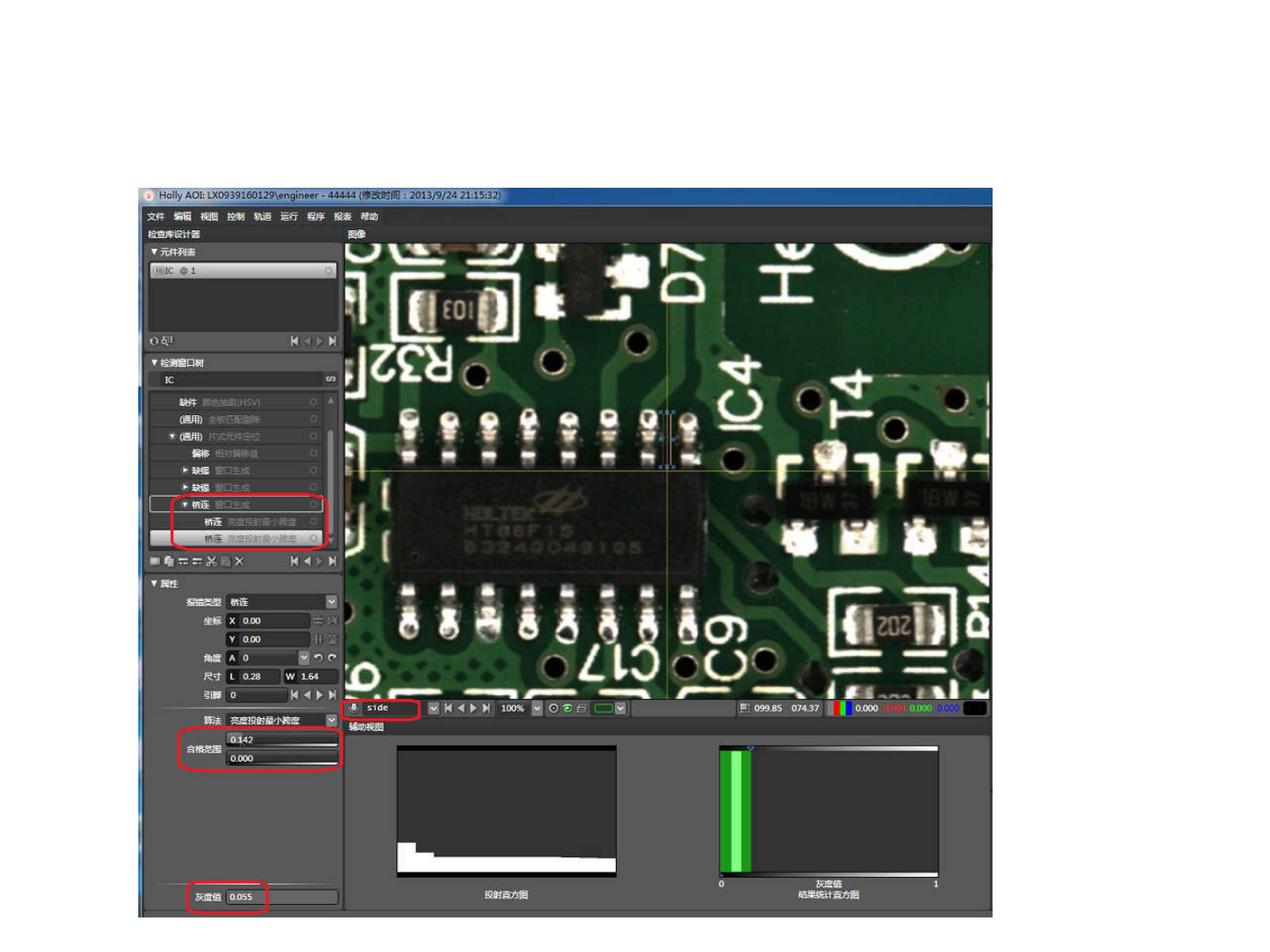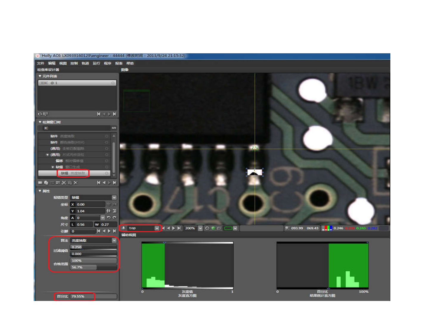 • a2) 虚焊 • 算法 : 亮度抽取 • 光源 : top.lum|side.lum • 参数设定 : 色相 , 饱和度 , 明度合格范围