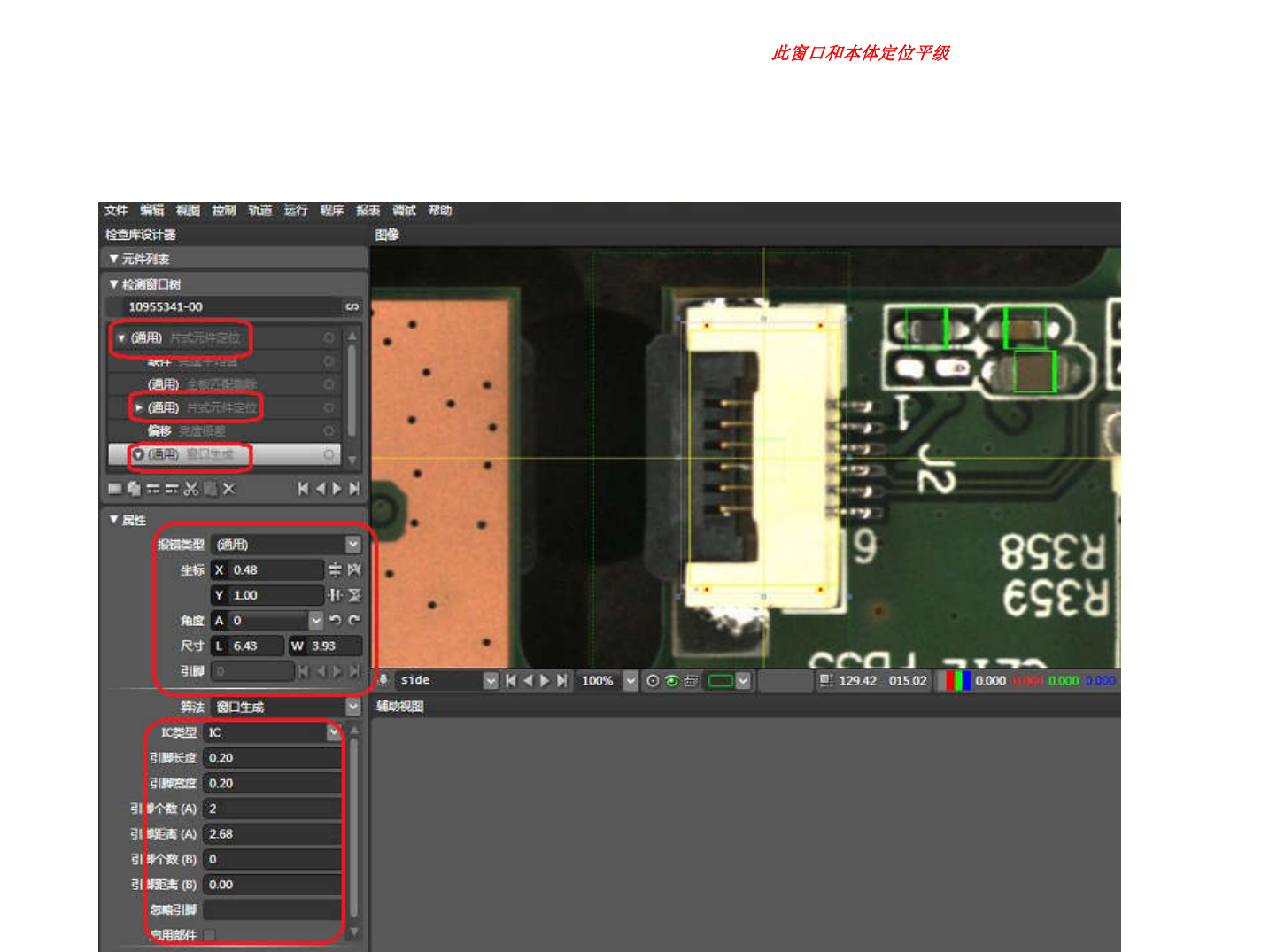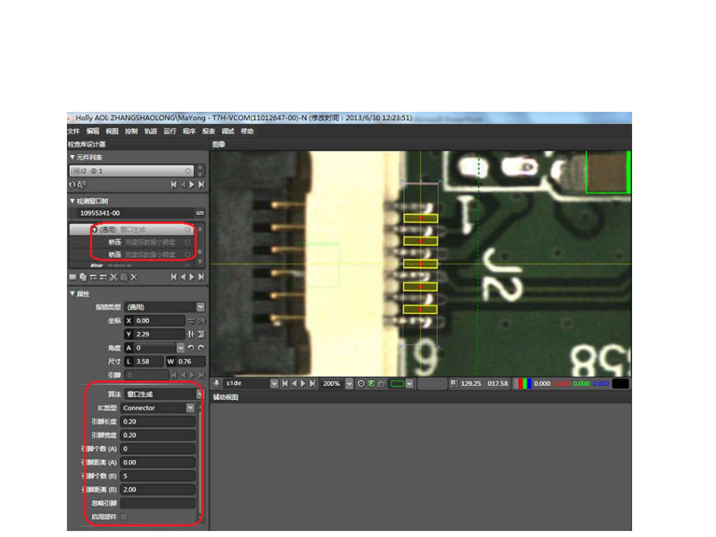 • 1.3.4. 桥连 • a1) 算法 : 窗口生成 ( 此项只进行引脚生成 , 不进行检查 ) • 光源 : 无 • 参数设定 : I C 类型 , 引脚个数 , 引脚距离 . • a2) 算法 : 亮度投射最小跨度 • 光源 : Side • 参数设定 : 合格范围