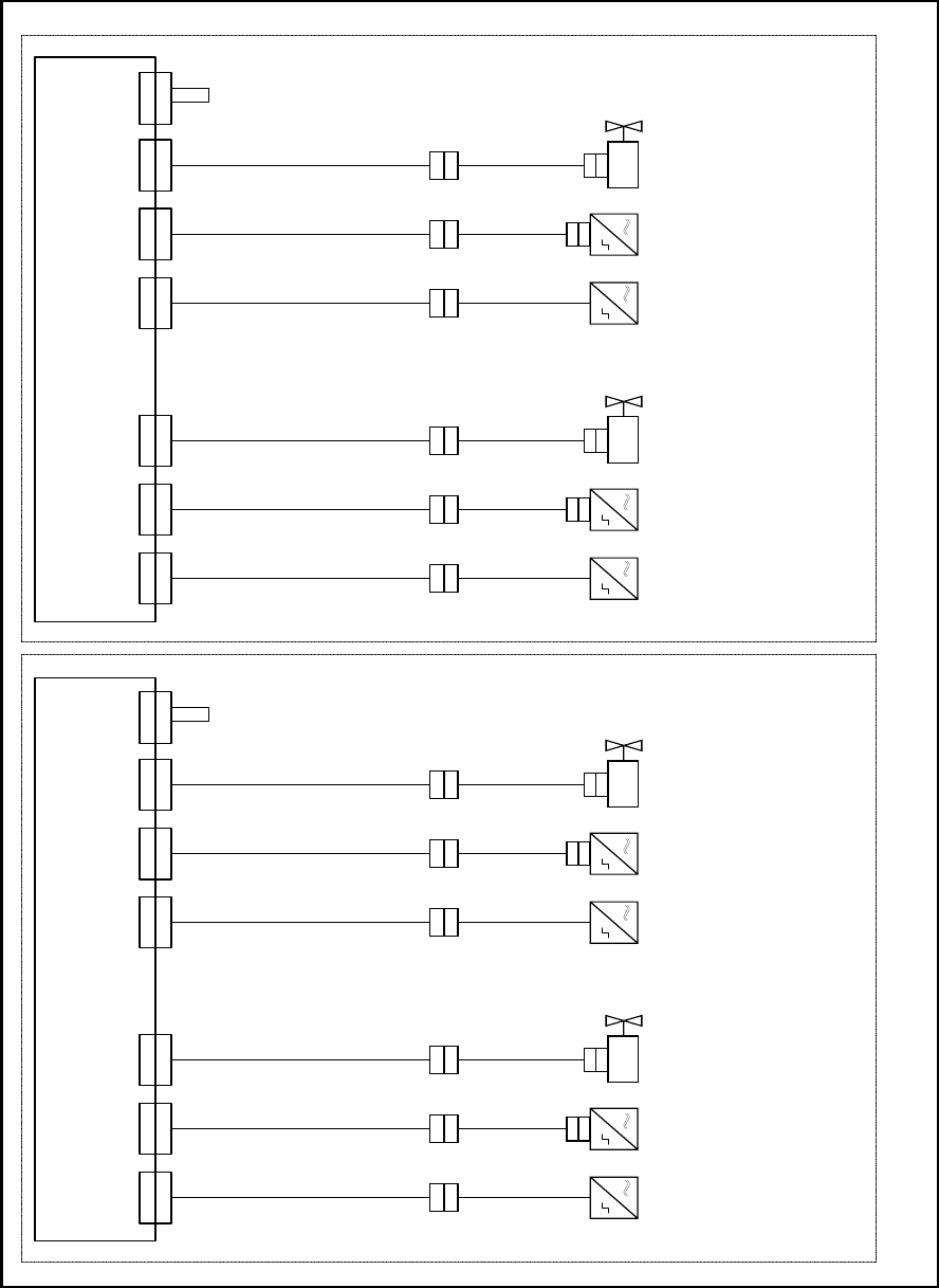 O Lay the three lines per unit (valve, sonar proximity switch and sensor) in the cable ducts to the