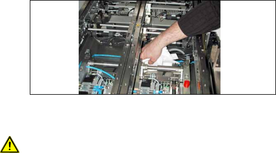 O Reinigen Sie die Transportwanne im Bereich der Führungsleiste mit einem mit Äthylalkohol be-
