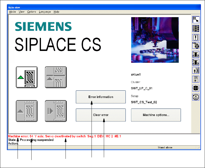 5 Error info rmation SIPLACE Software Guide Version 101.xx 5.2 Calling error information Issue 05/03 EN 54 5 Fig. 5.2 - 1 Main view with error message Key to Fig. 5.2 - 1 (1) T ype of error (T rack, machin e, transport o…