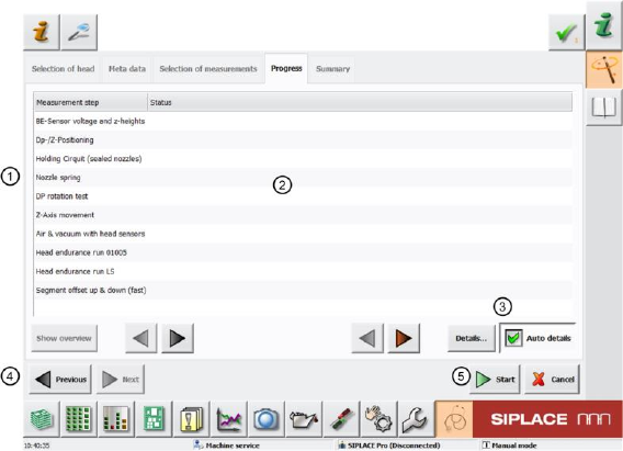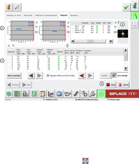 SIPLACE „Head Ver ification“ Bedienungsanleitun g Ausgabe 01/2015 11 2.2.4 Übersicht Messungen und Fortschritt - Progress Abbildung 4: Über s icht Messunge n und Fortschritt Im Menü „Progress“ k ann m an folgende Informa…