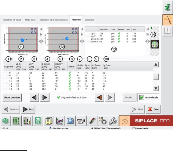 SIPLACE „Head Ver ification“ Bedienungsanleitun g Ausgabe 01/2015 78 4.15.2 Erklärung des Messergebnisses im Menü Progress Nach Beendigung der Mes sung erscheint im Menü Progress f olgendes Ergebnis: Abbildung 54 : Ergeb…