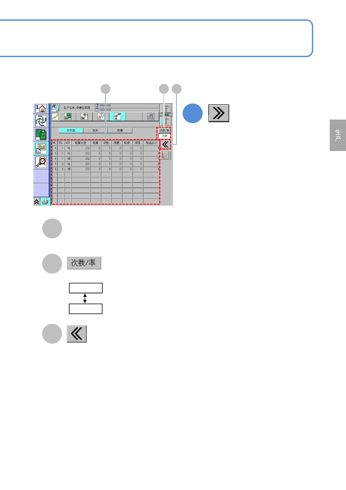 NPM-D3 EJM6DC-MB-03O-08 3-2-1 1 -2 A B 返回原来画面。 C 各供料器的吸着信息 ( → P .3-2-1 -8 ) 选择表示的种类。 2 ( 显示错误的详细信息 ) 次数 率 A B C