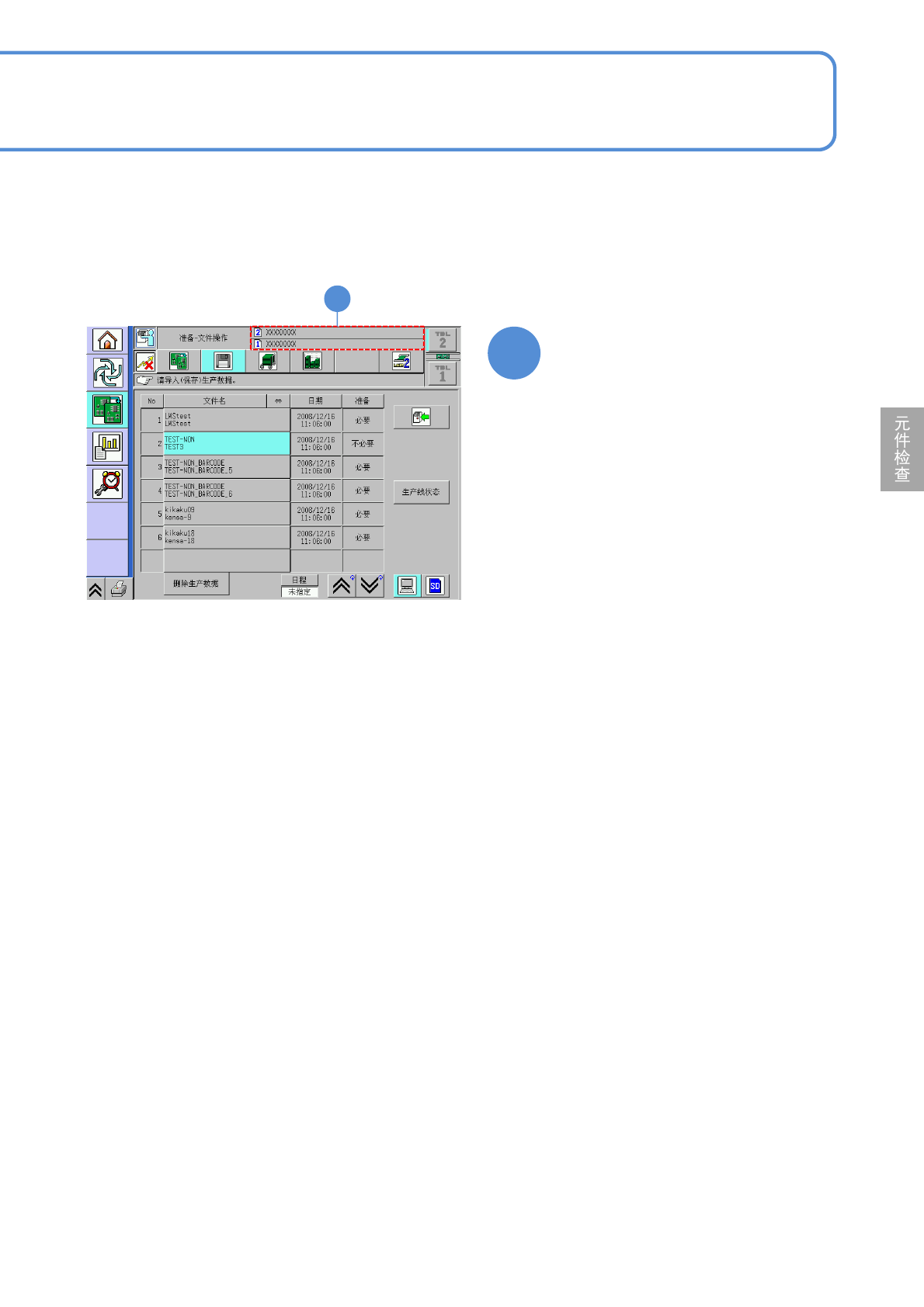 NPM-D3 EJM6DC-MB-04O-05 4-3-2 -1 生产数据 和校正 校正基板的摄像 1 生产数据的读取 1 操作篇 4-3-2 1 ●器件对象切换为 LNB 。 ( 显示在 LNB 一览表登录的数据的文件名 称 ) 3 选择读取的文件名称 ( 所选择的文件名称变成浅蓝色 ) ●按 [ 日期 ] ,文件 名称按照日期从新到旧 的顺序重新排列。 2 3 4 ( 数据开始下载 ) 为了在「 2D 检查编辑器」编辑数据,对使用元…