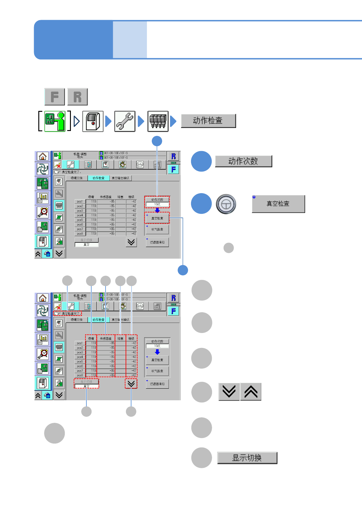 切换阀门,对于真空、吹气时的动作是否正常进行个别确认。