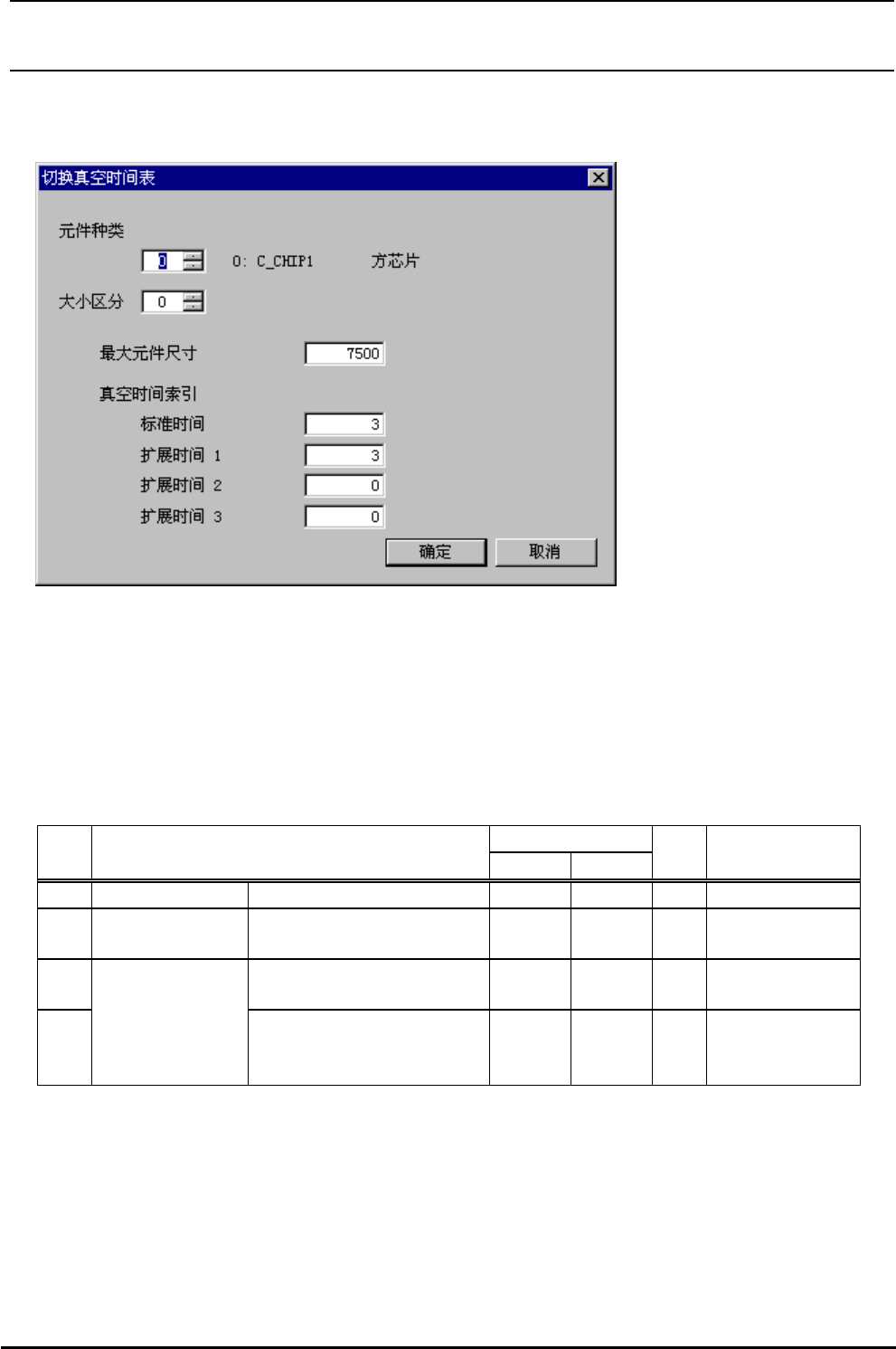 R e v 2 . 0 0 机器控制参数 4-87 4-5-12 真空(真空同步时间变换表) 图 4-5-12 真空同步时间变换表 (1) 设定画面的显示方法 菜单∶ [ 输入 ]→[ 其它 ]→[ 真空 ]→[ 真空时间变换 ] 起动∶ [ 其它 ] 按键 →[ 真空 ] 标签 →[ 真空时间变换 ] 按键 (2) 设定项目 输入范围 № 项目 最小值 最大值 单 位 备考 1 元件种类 0 49 参照 (3) 元件种类 2 尺寸分类…