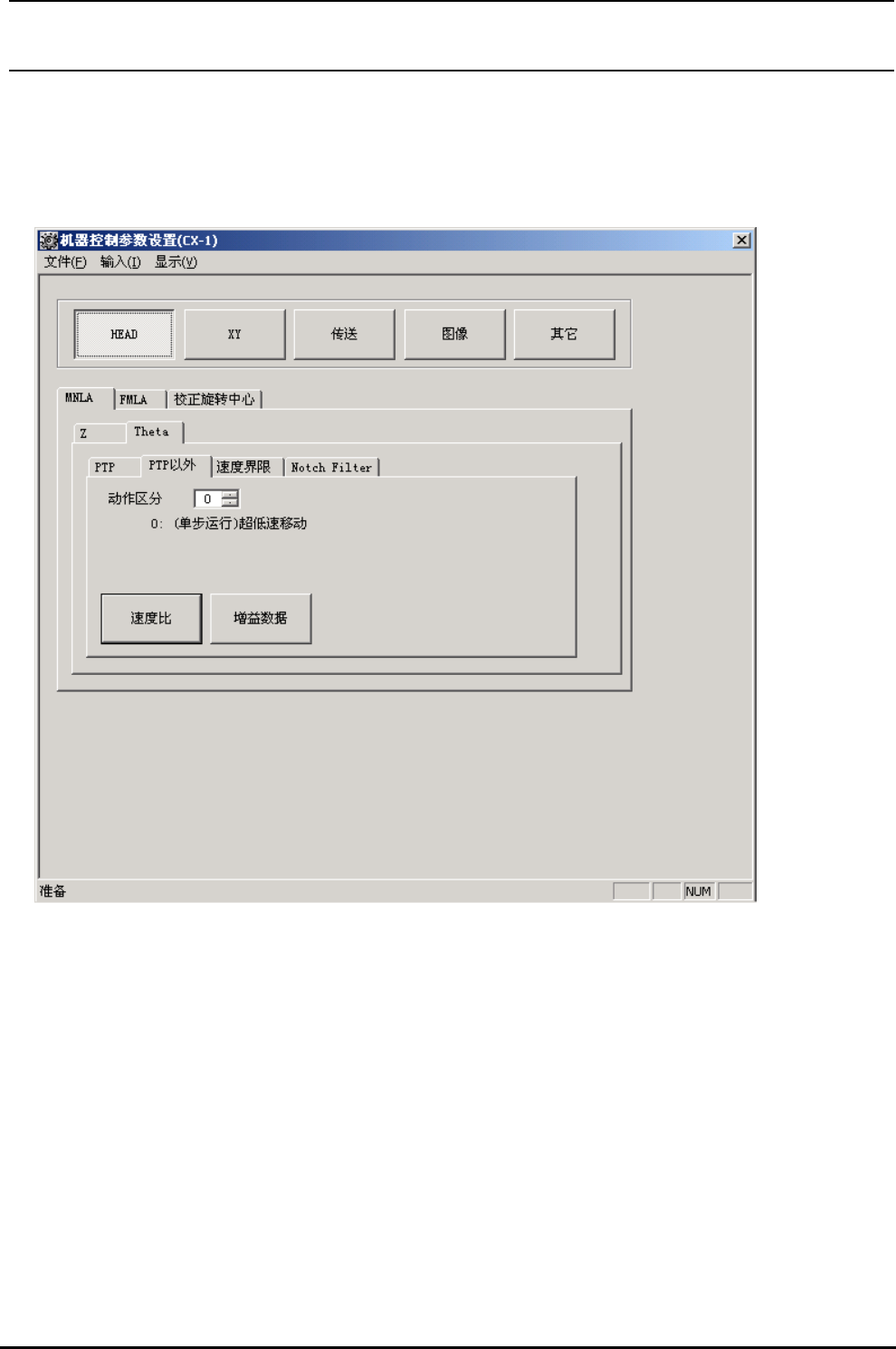 R e v 2 . 0 0 机器控制参数 3-3 3-1-3 θ 轴 PTP 动作的起动画面 选择了 [MNLA][T][PTP] 或 [FMLA][T][PTP] 之后,就会显示出如图 3-1-3 所示的表格。 这是选择 [MNLA] 时的画面。 图 3-1-3 θ 轴 PTP 动作的起动画面 把 “ 动作类别 ” 、 “ 速度类别 ” 设 定到想编辑的目录中,选择了 [ 速度比 ] 按键或 [ 增益数据 ] 按键之后,设定的 分类选…