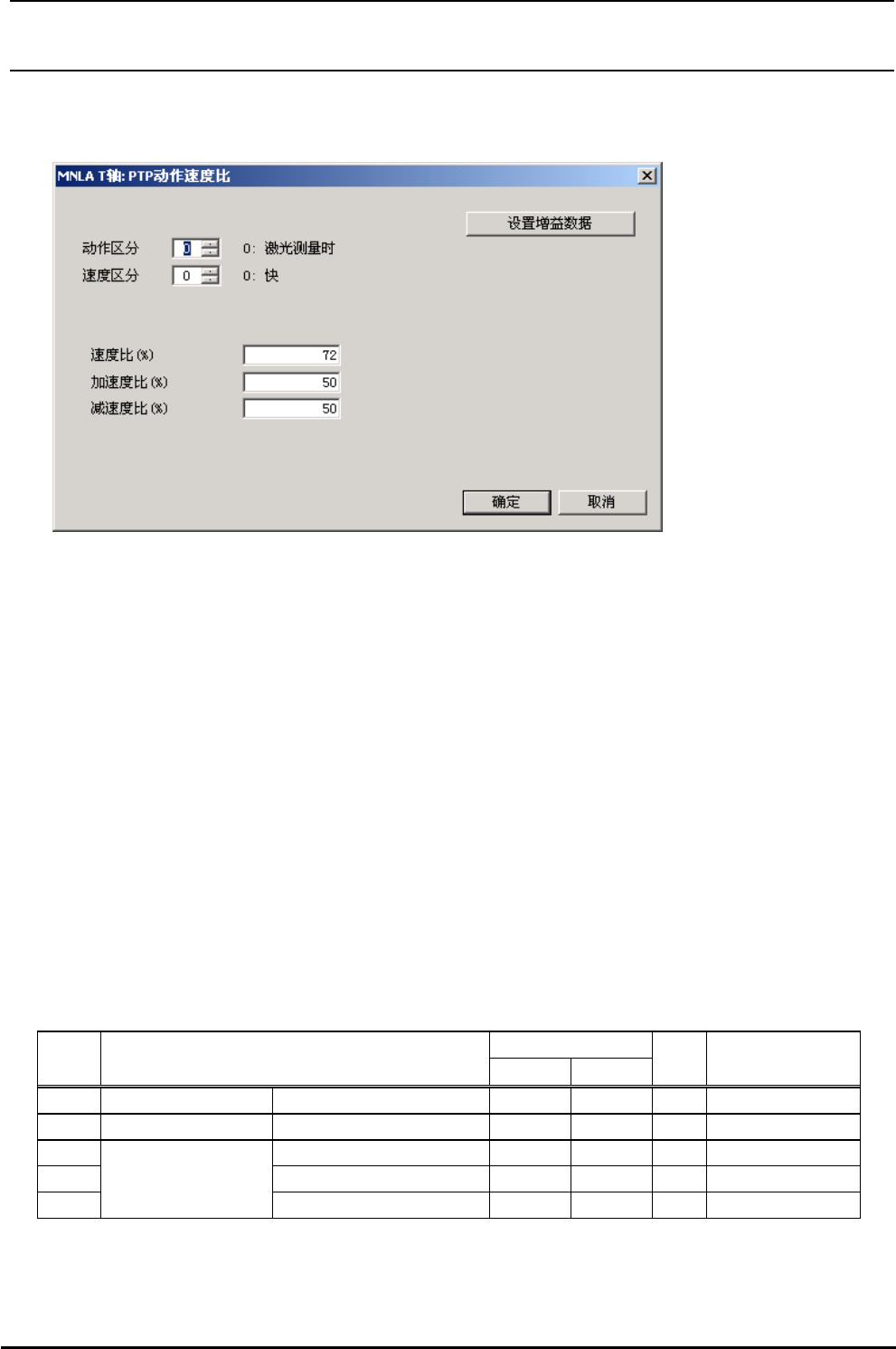 R e v 2 . 0 0 机器控制参数 4-15 4-1-7 θ 轴 PTP 动作的速度比 图 4-1-7 θ 轴 PTP 动作的速度比 [1] 设定画面的显示方法 菜单∶ MNLA 时, [ 输入 ]→[Head]→[MNLA]→[T]→[PTP]→[ 速度比 ] F M L A 时, [ 输入 ]→[Head]→[FMLA]→[T]→[PTP]→[ 速度比 ] 起动∶ MNLA 时, [Head] 按键 →[MNLA]Tab→[T…