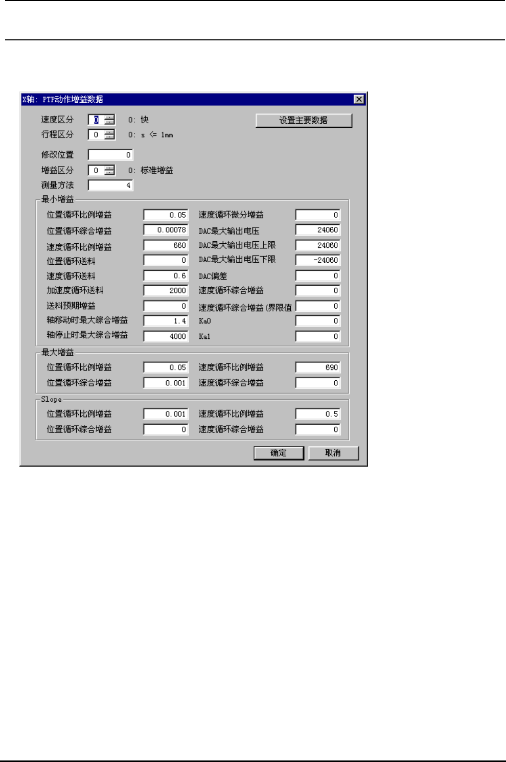 R e v 2 . 0 0 机器控制参数 4-30 4-2-2 PTP 动作的增益 图 4-2-2 PTP 动作的增益 (1) 设定画面的显示方法 菜单∶ X 时, [ 输入 ]→[XY]→[X]→[PTP]→[ 增益 ] Y 时, [ 输入 ]→[XY]→[Y]→[PTP]→[ 增益 ] 起动∶ X 时, [ X Y ] 按键 →[X] 标签 →[PTP] 标签 →[ 增益数据 ] 按键 Y 时, [ X Y ] 按键 →[Y] 标签…