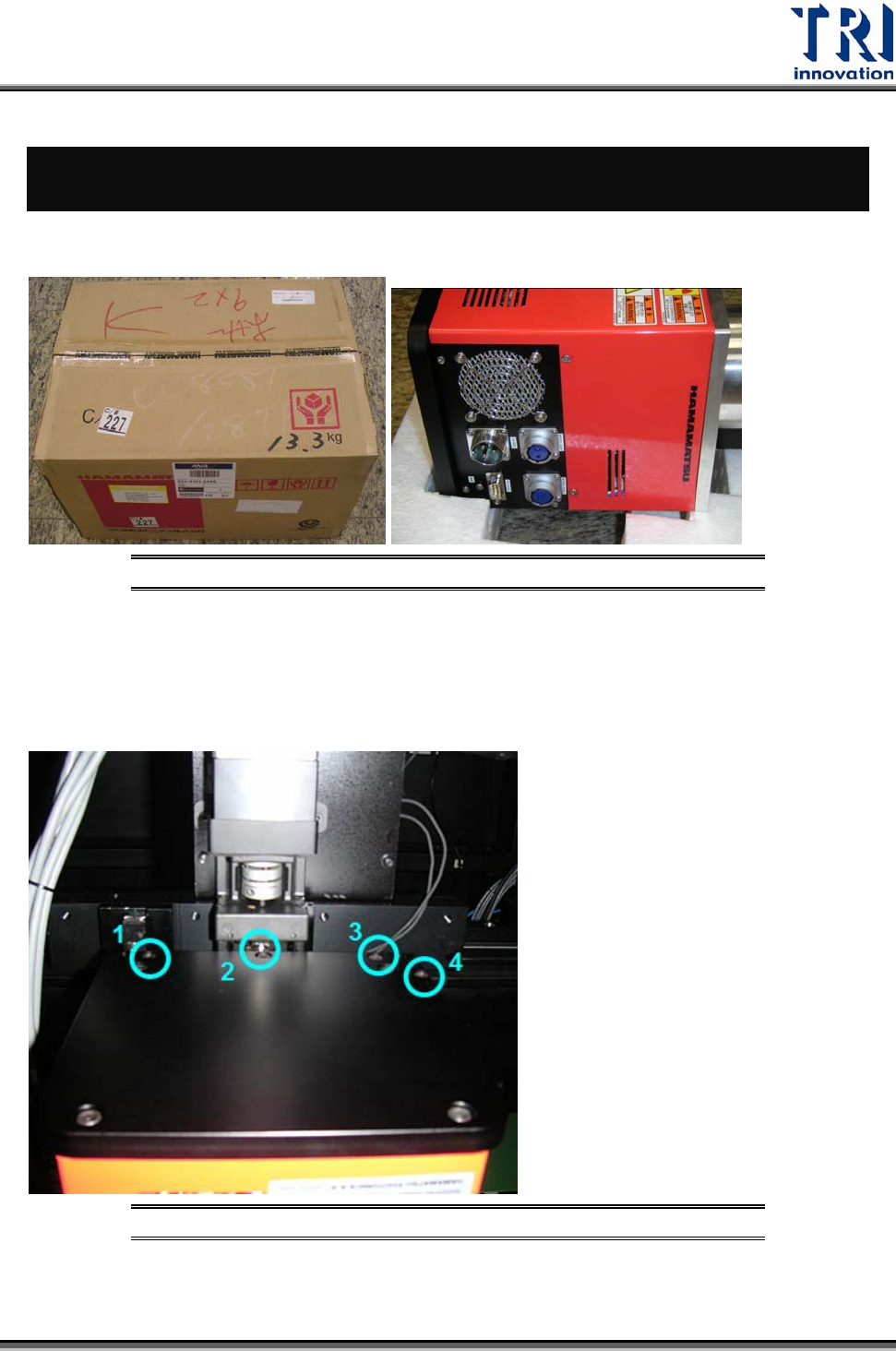 Test Research Inc. 6 安裝 X-R AY S OURCE 1) 將 X-Ray Tube 從紙箱中取出,過程請小心避免碰撞。 圖 8: 取出 X-Ray Tube 2) 將 X-Ray Tube 安裝到 X-Y Table 上, X-Ray Tube 接頭的方向朝左。 3) 鎖上四顆螺絲,如下圖所示。 圖 9: 鎖上 X-Ray Tube TR7600 User Guide ‐‐ Installation…