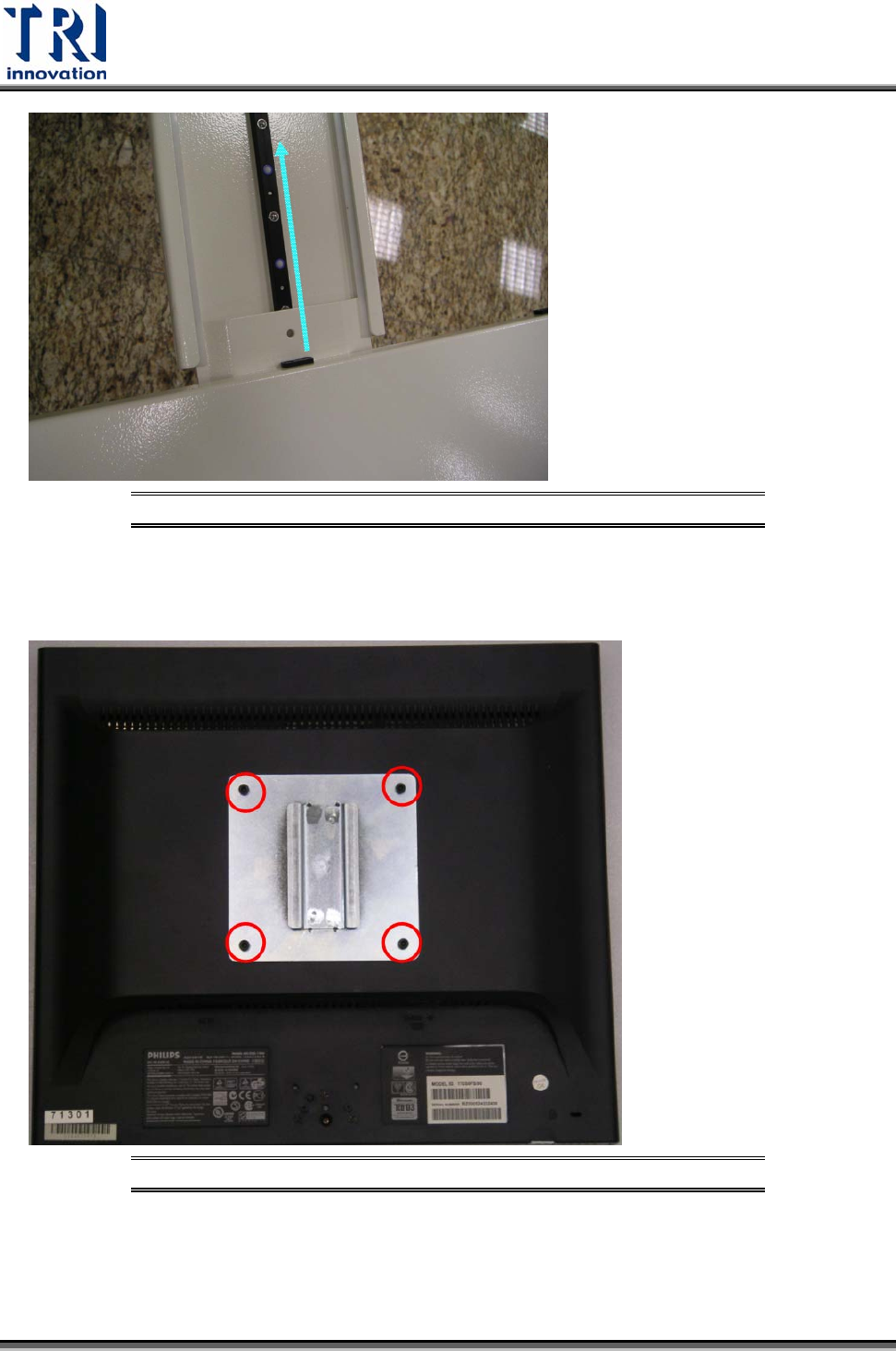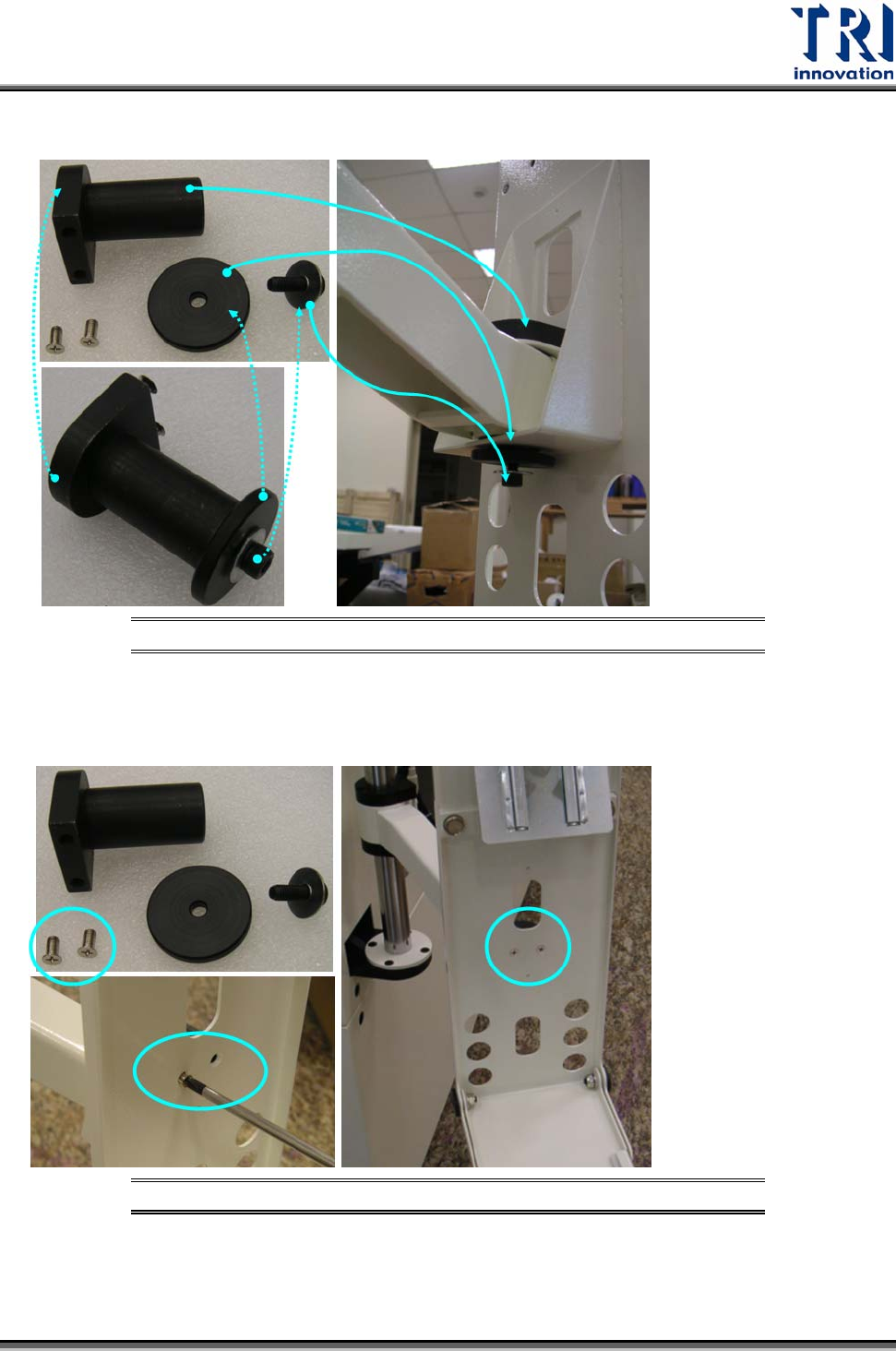 Test Research Inc. 10) 安裝軸承固定,並將下方螺絲鎖緊。 圖 22: 安裝軸承固定 11) 鎖上軸承螺絲 圖 23: 鎖上軸承 12) 安裝鍵盤滑鼠座。將鍵盤滑鼠座順著凹槽推入承盤上。 TR7600 User Guide ‐‐ Installation 19