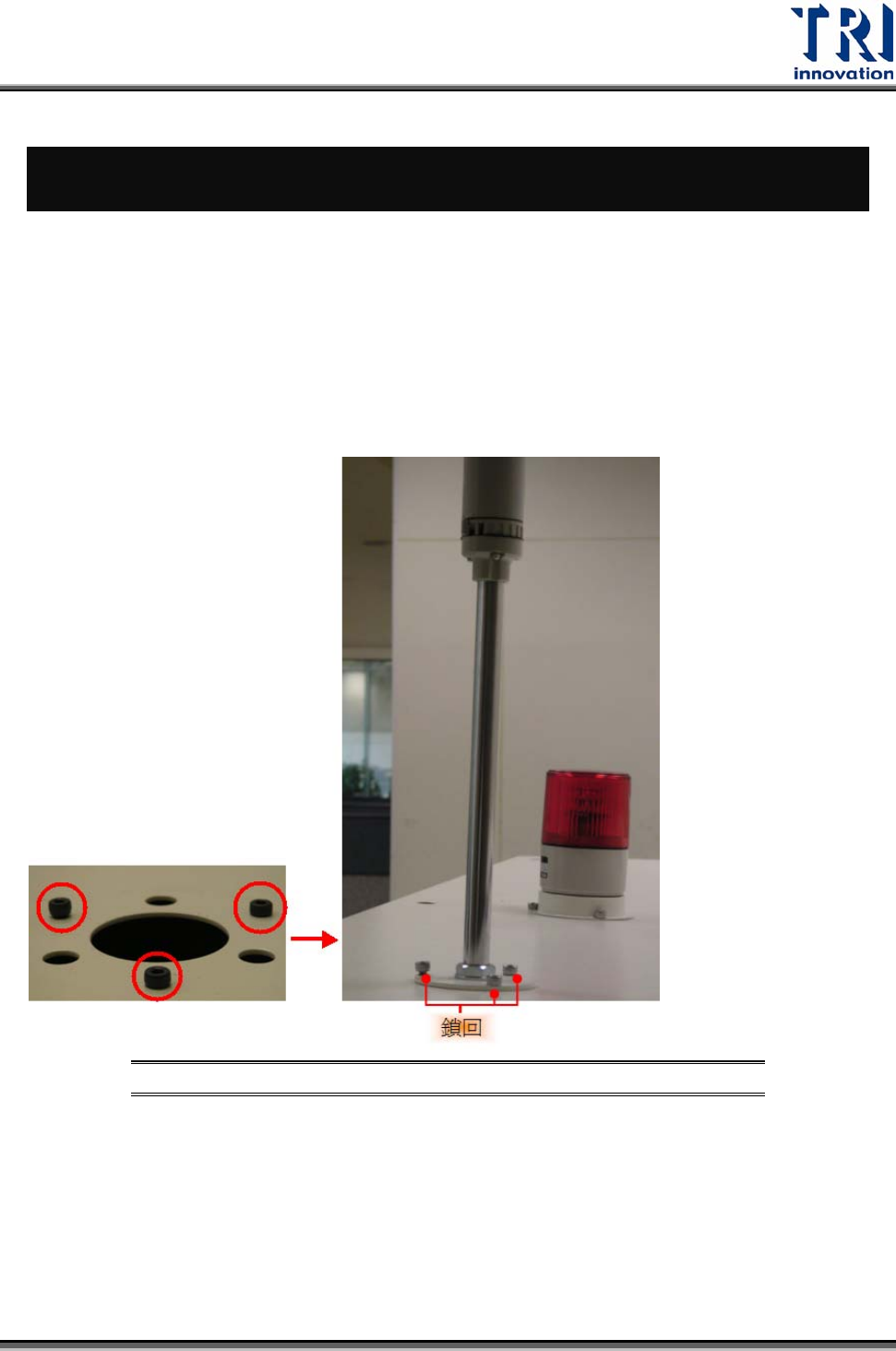 Test Research Inc. 9 周邊組裝 9.1 三色燈組裝 將三色燈裝至機台於正面右上方處,並用六角螺絲鎖緊後於下方將接頭連接起來。 1) 從配件箱中取出三色燈。 2) 使用 M4x12 螺絲。螺絲已鎖在機台上蓋安裝三色燈的地方,需拆卸螺絲後將三 色燈以原螺絲座鎖回該處。 圖 29: 組裝三色燈 3) 連接內部接頭。 將三色燈與內部預留接頭接上 TR7600 User Guide ‐‐ Installation …