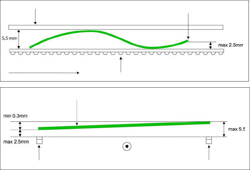 传送方向的 PCB 翘曲度 + PCB 的厚度 < 5.5 mm 。印制板边缘的弯曲