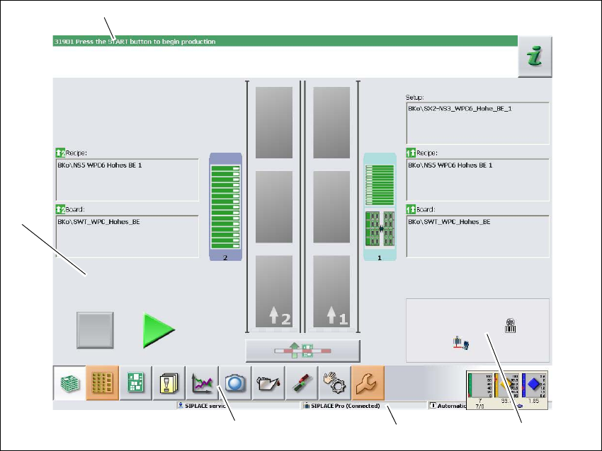 图 5.5 - 1 “Production (生产)” 图示中用户界面的组成部分 (示例为 SIPLACE X4i 型贴片机)
