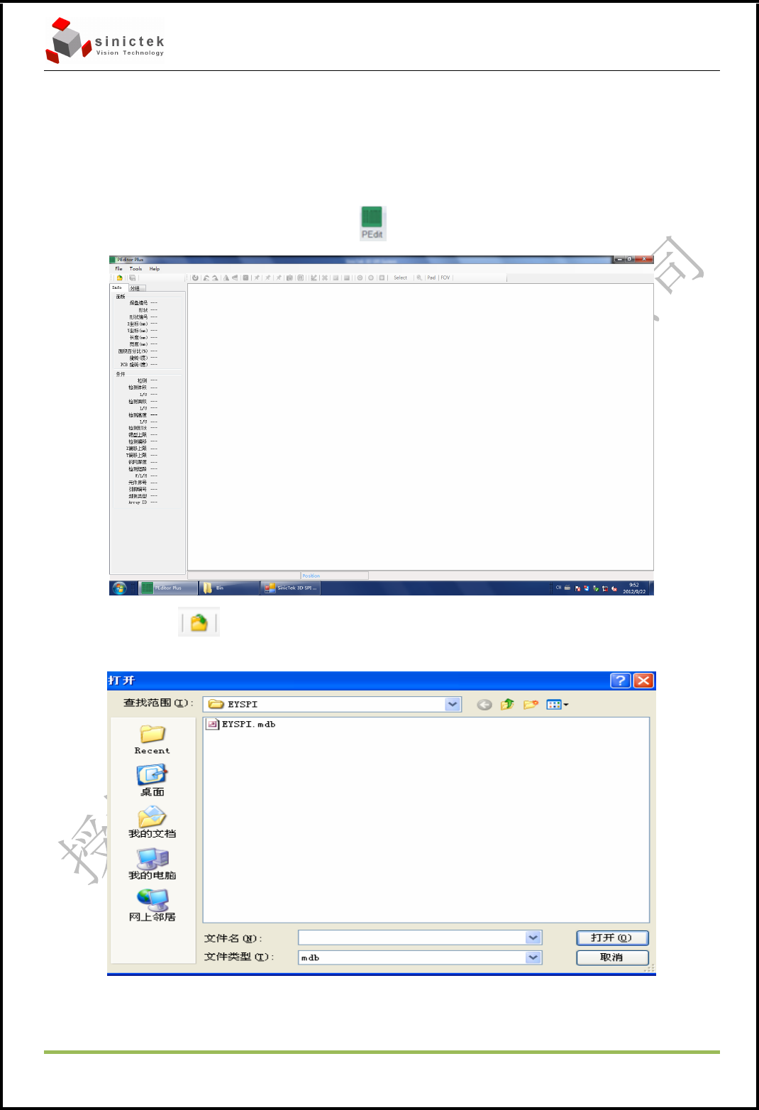 3D SPI 操作手册 思泰克光电 科技有限公司 Page 29 Copyright by Sinic-T ek V isi on T ec hnolog y Co., L td. 5.2.5 界面 5.2.5.1 软件界 面 采用 图 标式 功 能 按键 ,只要 鼠 标 点到即 会 启 动 相应 功能, 按 键 如 下图: 5.2.5.2 常用功能按键: Pad Condition——检测参数设定 Mark——标示 Mark 点 Sc…