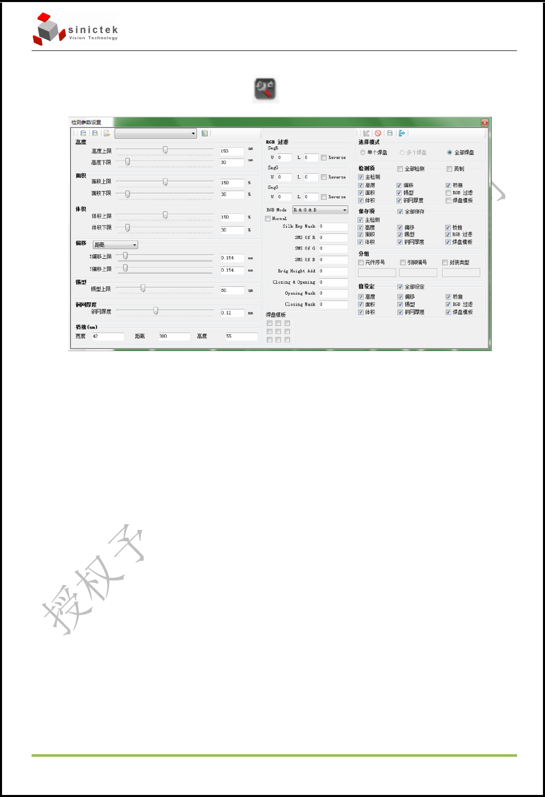 3D SPI 操作手册 思泰克光电 科技有限公司 Page 30 Copyright by Sinic-T ek V isi on T ec hnolog y Co., L td. 5.2.6 对检测指标的范围进行设定 对检测工艺范围进行设定,点击 ,弹出以下窗口 5.2.6.1 Check 选择你要检测的项目。 (例如选定 Check Area,则会对面积进行 检测,不选择则不检测。 ) - Check Height 检查高度; - …