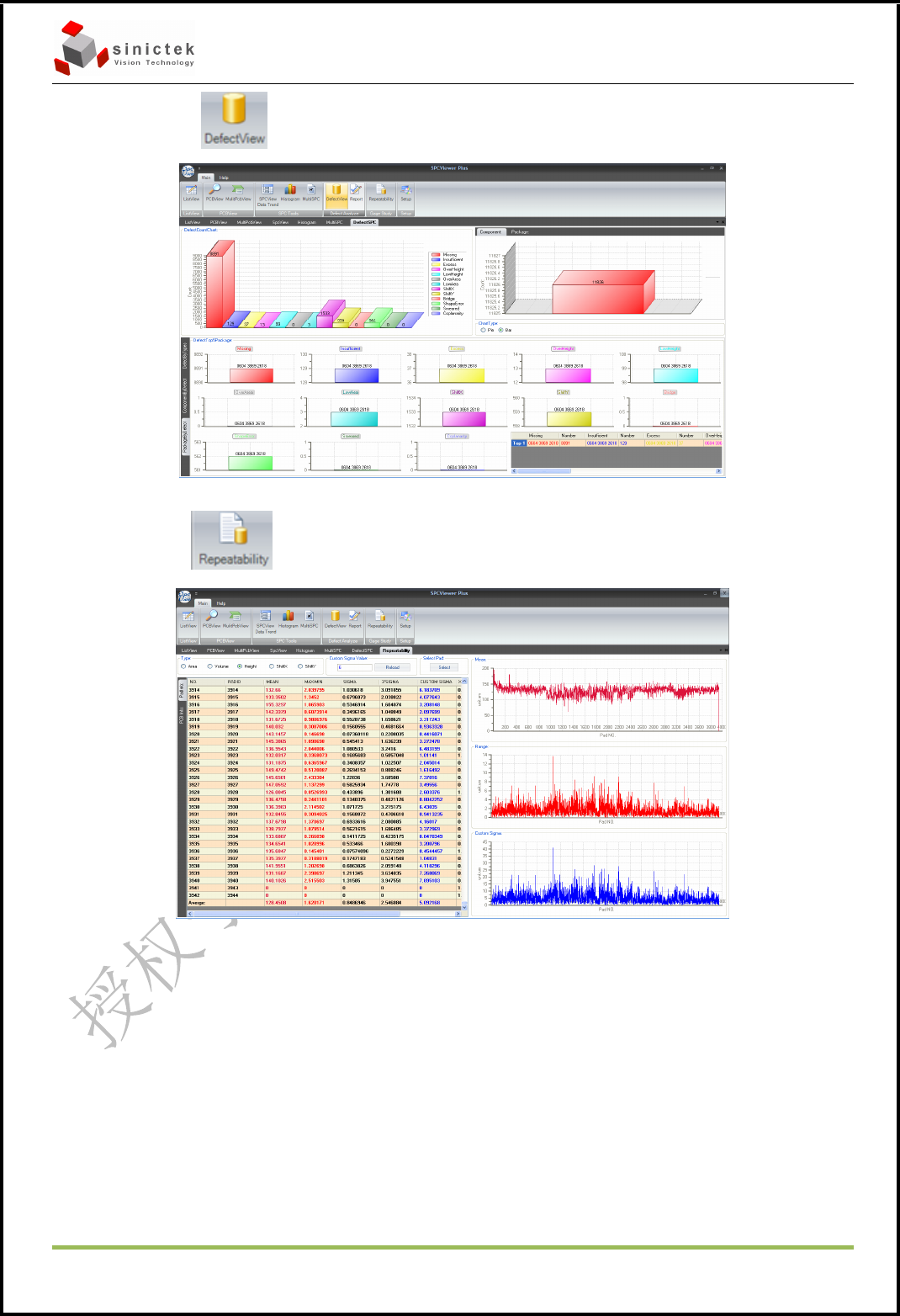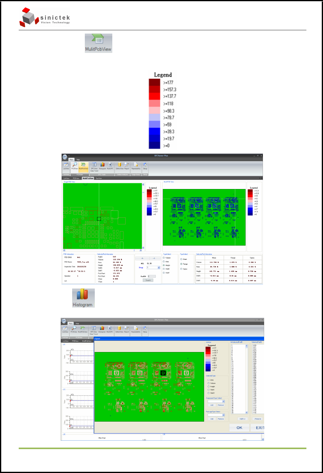 3D SPI 操作手册 思泰克光电 科技有限公司 Page 35 Copyright by Sinic-T ek V isi on T ec hnolog y Co., L td. 6.9 点击 可以用柱状图和饼状图进行查看如下图: 6.10 点击 可以对一些焊盘进行查看6个Sigma、 平均值和每个焊盘的分布状况
