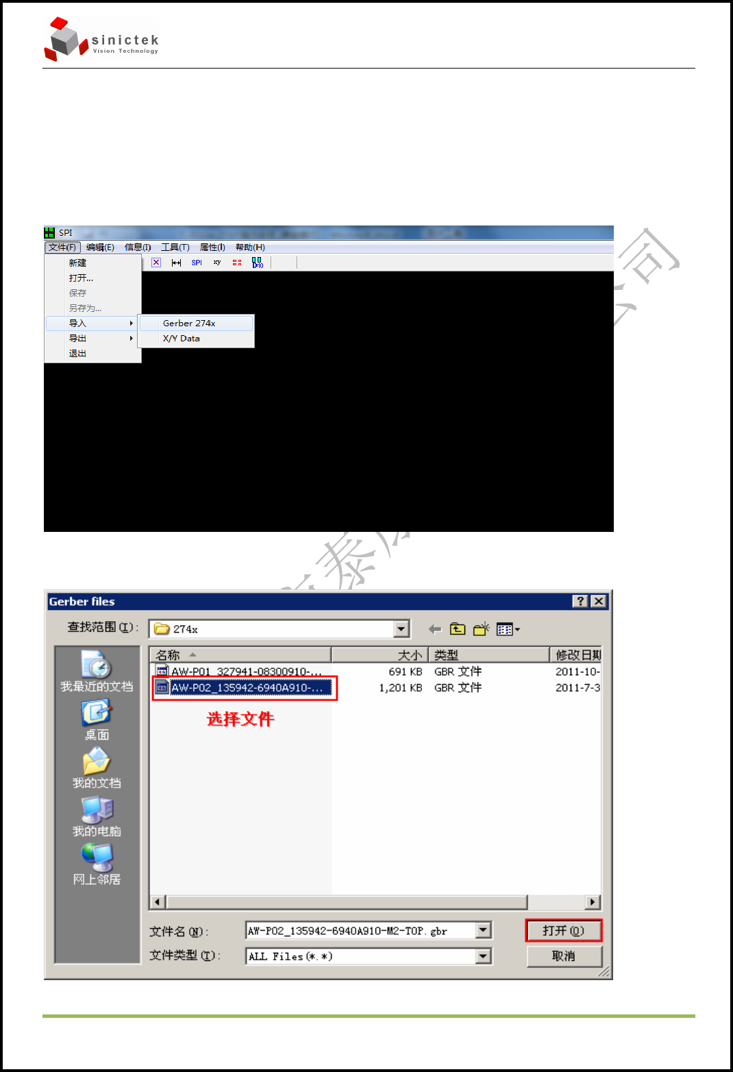 3D SPI 操作手册 思泰克光电 科技有限公司 Page 8 Copyright by Sinic-T ek V isi on T ec hnolog y Co., L td. 四. JOB 程序制作及检测操作 4.1 Ger ber 转换软件 Z YSP I 4.1.1 导 入数据 描述:启动 ZY SPI 软件,导入要处理的 数据。 文件菜单 : 文 件 -> 导入 - >Ger ber274x 选择导入的文件: