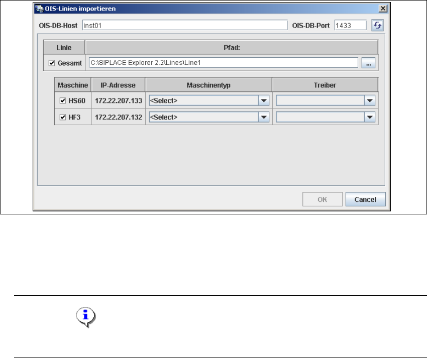 → Sie können eine vorhandene Fertigungslinie über den OIS-Import importieren. Betätigen Sie